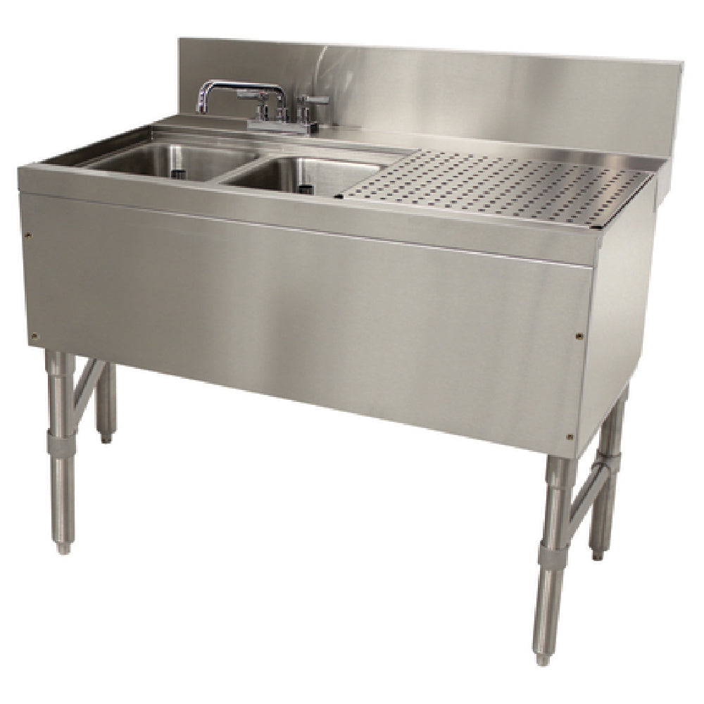 The Advance Tabco PRB-24-32L Prestige Underbar Sink Unit is a meticulously engineered two-compartment sink tailored for the nuanced needs of underbar environments across various industry sectors. Measuring 36 inches in width, 25 inches in depth, and 36 inches in height, this unit is compact yet highly functional. The sink bowls are sized at 14 inches front-to-back, 10 inches left-to-right, and 10 inches deep, facilitating efficient usage in high-demand settings. An 11-inch drainboard on the right provides ample space for drying and organization. The unit features a 7-inch high backsplash, which aids in maintaining cleanliness and preventing water spillage onto surrounding surfaces. Constructed entirely from stainless steel, including the open frame base and side crossrails, the unit promises durability and resistance to corrosion, making it suitable for rigorous use in hospitality and service industries. Included is a deck mount faucet with a 6-inch swing spout, ensuring versatile water flow management. The product is NSF certified, confirming its compliance with stringent public health and safety standards, vital for professional environments. The Advance Tabco PRB-24-32L is designed to deliver exceptional functionality and reliability, making it an indispensable asset for bars, restaurants, and catering operations.
