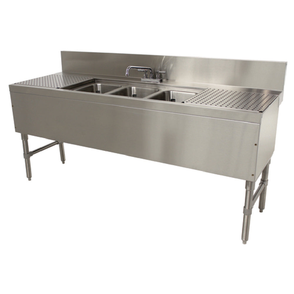 The Advance Tabco PRB-24-83C Prestige Underbar Sink Unit is a meticulously designed piece of equipment, tailored for the needs of the food service industry with a focus on functionality and efficiency. This underbar sink unit features a substantial width of 96 inches, a depth of 25 inches, and a height of 36 inches, providing ample space and convenience for various tasks. It includes three sink compartments, each measuring 14 inches front-to-back, 10 inches left-to-right, and 10 inches deep, facilitating multiple uses from washing to rinsing and sanitizing. Enhanced by 30-inch drainboards on both the left and right sides, this unit ensures optimal workflow and organization. The 7-inch high backsplash offers protection against spills and splashes, maintaining cleanliness and hygiene. Constructed with durable stainless steel, this unit includes an open frame base and side crossrails for added stability. The inclusion of a deck mount faucet with a 12-inch swing spout further underscores its practicality in busy environments. Certified by NSF, this underbar sink unit meets rigorous health and safety standards, making it an ideal choice for bars, restaurants, and catering services requiring a reliable and robust solution for their washing needs.