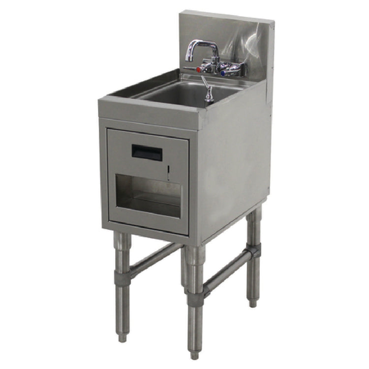 The Advance Tabco PRHSST-19-18 Prestige Hand Sink Underbar is a highly functional piece of equipment measuring 18"W x 20"D x 36"H overall, designed specifically for enhancing the efficiency of underbar operations. This unit features a 10" wide x 14" front-to-back x 7" deep bowl, providing ample space for handwashing needs in tight spaces. It is equipped with a splash mount faucet that includes a 6" spout, ensuring a convenient water flow for users. The 7"H backsplash helps maintain cleanliness by reducing water splashes on surrounding areas. Additionally, the sink comes with a deck mounted soap dispenser and a c-fold towel dispenser, streamlining the handwashing process by providing easy access to essential hygiene supplies. Constructed from stainless steel, this hand sink is built for durability and ease of maintenance, making it a reliable choice for high-traffic environments. The adjustable bullet feet enable precise leveling on uneven surfaces, ensuring stability. Certified by NSF, this product meets strict public health and safety standards, making it a suitable option for bars, restaurants, and commercial kitchens looking to maintain a hygienic environment while optimizing space and functionality.