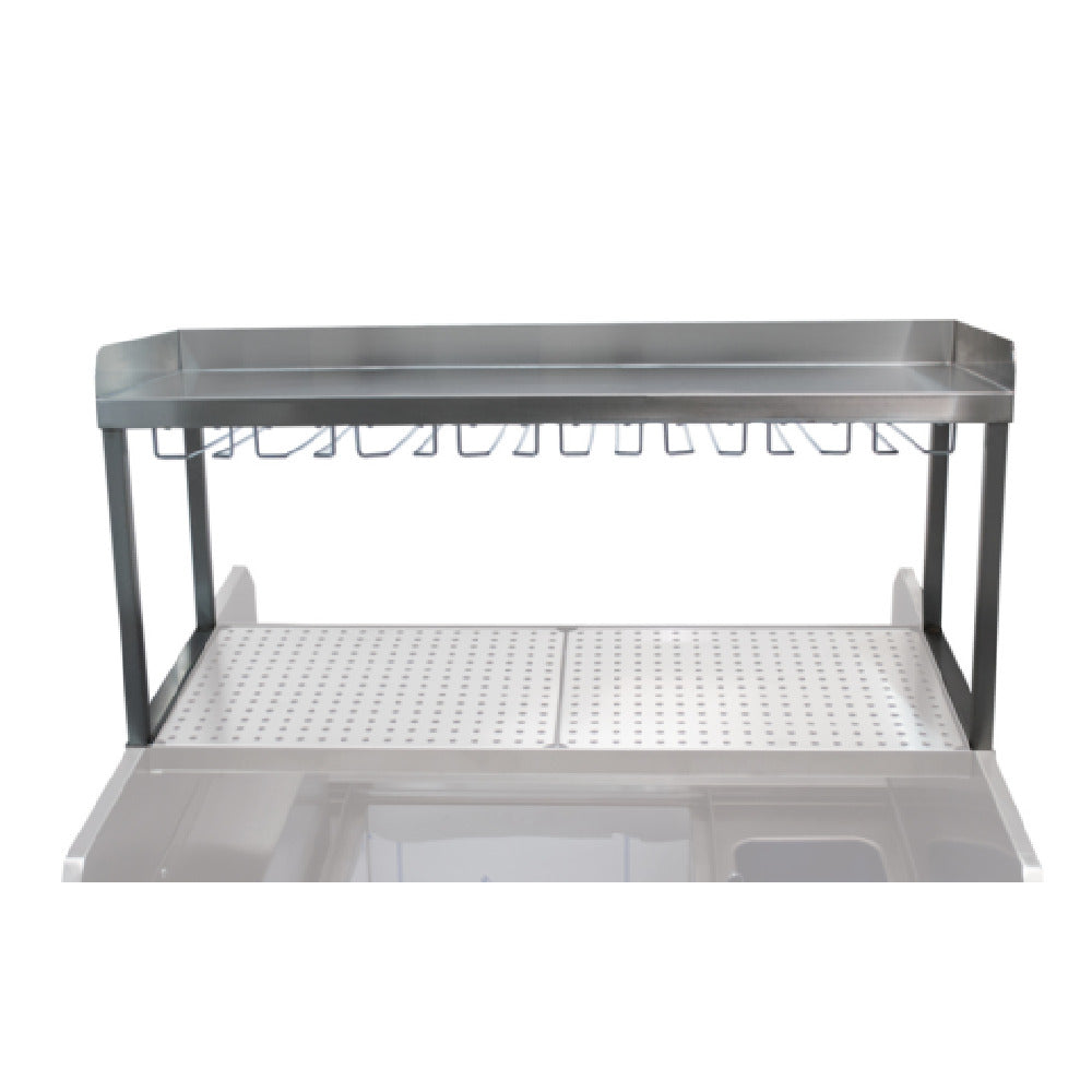 The Advance Tabco PRSO-44-G Pass-Thru Station Additional Single Overshelf is designed to enhance the functionality of commercial workstations by providing additional storage space. Measuring 44"W x 16-3/4"D x 15-1/4"H, this overshelf is crafted from high-quality 18 gauge 302 series stainless steel, ensuring durability and longevity in demanding food service environments. Its solid shelf features three raised edges with an open front, optimizing accessibility while preventing items from sliding off the sides and back. A built-in stemware glass rack is incorporated under the top shelf, making it ideal for establishments that require organized glass storage. The tubular legs provide sturdy support, and the overshelf is designed to be mounted onto Prestige pass-through workstations with a standard perforated drainboard shelf. This configuration yields a double-tier shelf system, maximizing vertical storage potential. With its NSF certification, the PRSO-44-G adheres to rigorous health and safety standards, offering peace of mind to operators in the food industry. Suitable for bars, restaurants, and catering services, this versatile overshelf enhances efficiency by keeping essential items within easy reach while maintaining an organized work area. Its robust construction and intelligent design make it a valuable addition to any professional kitchen setup.