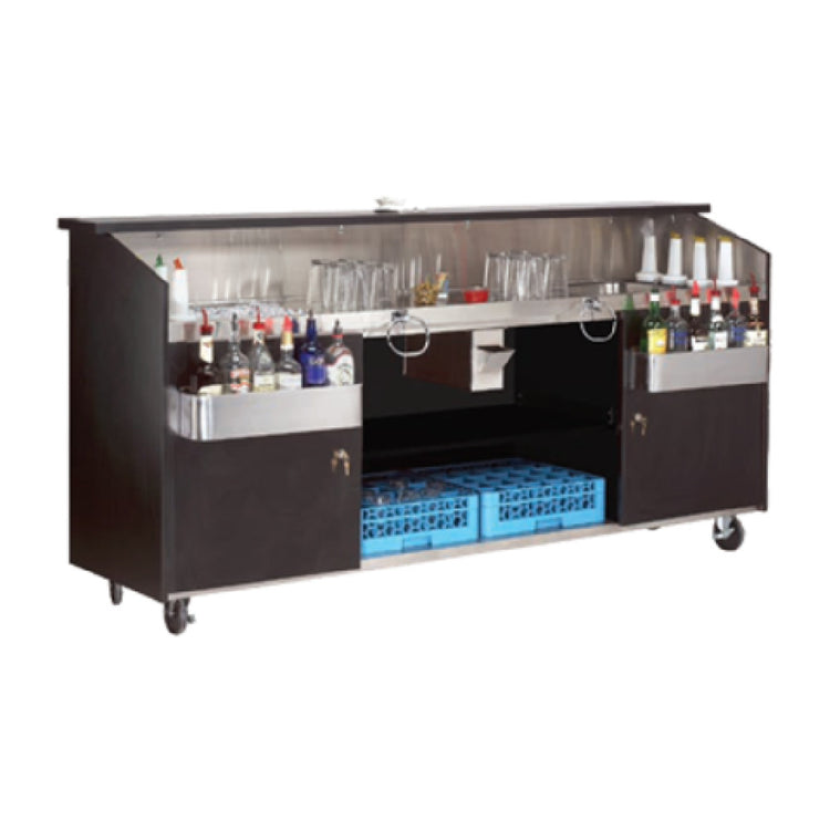 The Advance Tabco R-8-B Portable Bar is engineered for versatility and efficiency, measuring 95-3/4"W x 24-1/2"D x 47"H. This portable bar is equipped with two ice bins, each featuring drains and shut-off valves, ensuring optimal functionality for high-demand environments. The stainless steel worktop provides a durable and sleek surface, while the locking doors under each ice bin offer secure storage. With four bottle storage compartments, a built-in bottle cap catcher, and two towel rings, this unit is tailored for convenience and organization. Additionally, the inclusion of two stainless steel speed rails enhances quick access to frequently used items. The rear lower shelf provides additional storage, maximizing the unit's capacity to hold essential supplies. Finished in a classic black, the bar sits atop four 5" casters, two of which are braked, allowing for effortless mobility and stability. The Advance Tabco R-8-B is a smart choice for catering services, event venues, and hospitality settings, where portability and efficiency are paramount.