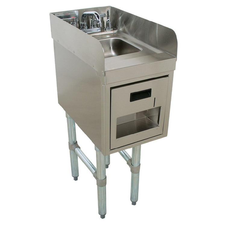 The Advance Tabco SC-15-TS-S Underbar Basics™ Hand Sink is a meticulously engineered, free-standing unit measuring 15 inches wide, 21 inches deep, and 32-7/8 inches high overall. It features a compact sink bowl with dimensions of 9 inches by 9 inches and a depth of 4 inches, making it optimal for efficient use in confined spaces. This hand sink is equipped with 4-inch high back and sidesplashes which are essential for maintaining cleanliness and preventing splashes in busy environments. It includes a 4-inch on-center deck-mounted faucet with a 6-inch swivel spout, offering flexibility and ease of use. Additionally, the unit comes with a built-in soap dispenser and c-fold towel dispenser, enhancing hygiene and convenience. Constructed from 300 series stainless steel, this sink is designed for durability and longevity, while the 18-gauge galvanized cross-braced legs with adjustable bullet feet ensure stability on uneven surfaces. NSF certification attests to its compliance with health and safety standards, making it a trusted choice for bars, restaurants, and other food service establishments requiring reliable handwashing stations. The Advance Tabco SC-15-TS-S combines functionality and robust construction to meet the diverse needs of the food service industry.