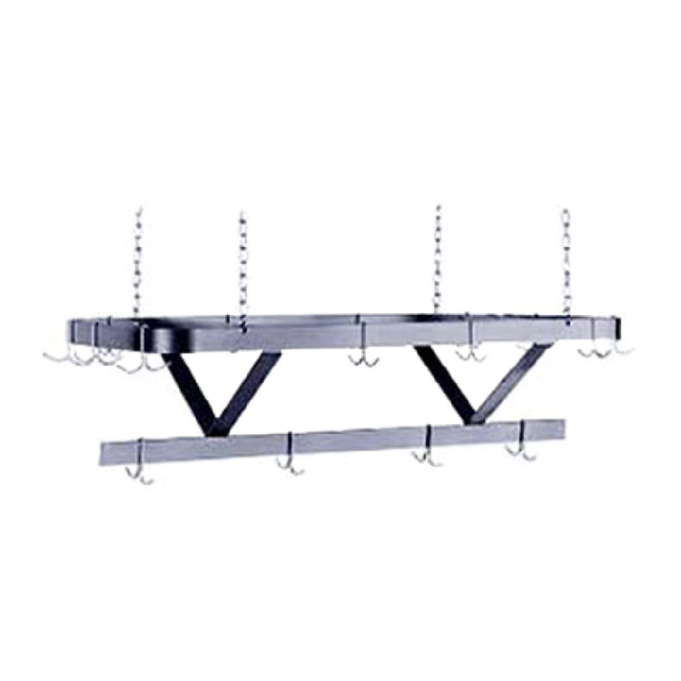 The Advance Tabco SC-84 Pot Rack Ceiling Hung Triple Bar Design is an exceptional storage solution for commercial kitchens seeking to optimize their space. This pot rack measures 84 inches in width and 22 inches in depth, providing an ample area for storing cookware. Constructed from a sturdy 1/4 inch by 2 inch stainless steel frame, it ensures durability and long-term use in demanding kitchen environments. The unique triple bar design maximizes hanging space and organization, making it suitable for a variety of kitchen layouts and size requirements. Included with the rack are 18 plated double pot hooks, offering versatile hanging options for various pot sizes and styles, enhancing organization and accessibility. Additionally, 24-inch plated hanging chains are provided, allowing the rack to be securely mounted from the ceiling at the desired height, further customizing the kitchen's storage setup. This ceiling-hung pot rack is particularly advantageous for kitchens with limited floor space, as it provides an effective off-the-ground storage option. The Advance Tabco SC-84 stands out in the commercial kitchen equipment market for its robust construction and efficient use of vertical space, appealing to restaurant owners, chefs, and culinary institutions aiming to improve kitchen functionality and aesthetics.