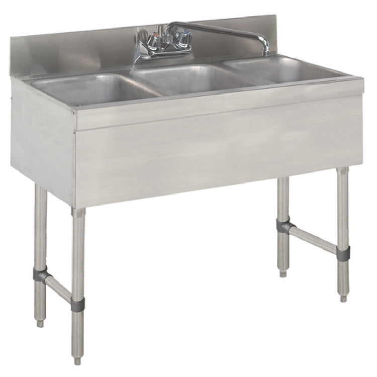 The Advance Tabco SLB-33C-X Special Value Underbar Sink Unit is a versatile and robust piece of equipment designed for efficiency in commercial settings. With its 36"W x 18"D x 33"H overall dimensions, this unit is compact yet provides ample functionality. It features three 10"W x 14"D x 10" deep fabricated sink bowls, making it suitable for a variety of tasks, from dishwashing to food prep, in busy kitchens, bars, or any underbar area. The 4"H backsplash helps prevent water and debris from damaging surrounding surfaces. Its splash mounted faucet with a 10" spout is designed for easy reach and maneuverability, enhancing the unit’s practicality. Constructed from stainless steel with a galvanneal understructure, the SLB-33C-X is built for durability and resilience, ensuring longevity in demanding environments. The galvanized legs, complete with front-to-back cross rails and adjustable bullet feet, provide stability on uneven surfaces, a crucial feature for high-traffic areas. This unit is NSF certified, highlighting its adherence to public health standards. The Advance Tabco SLB-33C-X is an excellent choice for establishments requiring a reliable, space-efficient sink solution without drainboards, catering to diverse operational needs in the food service industry.
