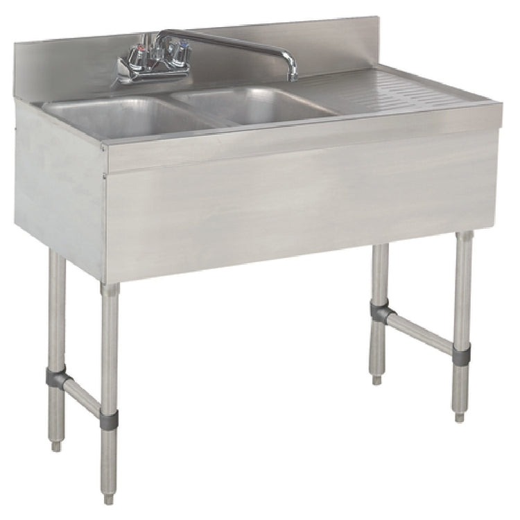 The Advance Tabco SLB-42L Special Value Sink Unit is a versatile 2-compartment sink solution, specifically designed to meet the rigorous demands of various industry segments, including restaurants, cafeterias, and commercial kitchens. With dimensions of 48"W x 18"D x 33"H overall, it provides ample space for efficient workflow. Each of its two sink compartments measures 10"W x 14"D x 10" deep, facilitating diverse washing tasks. This unit features a 4" high backsplash to help maintain cleanliness and protect walls from splashes. Equipped with a splash-mounted faucet boasting a 6" spout, it ensures convenient and controlled water flow. Additionally, the unit includes a right-side 21" drainboard for effective drying and staging of kitchenware. Constructed from durable stainless steel, it offers long-lasting performance and is supported by a galvanneal understructure for added structural stability. The galvanized legs, complete with front-to-back cross rails and adjustable bullet feet, provide enhanced sturdiness and adaptability to uneven surfaces. Adhering to NSF standards, the Advance Tabco SLB-42L ensures compliance with health and safety regulations, making it an excellent choice for professionals seeking a reliable and efficient sink unit for their commercial operations.