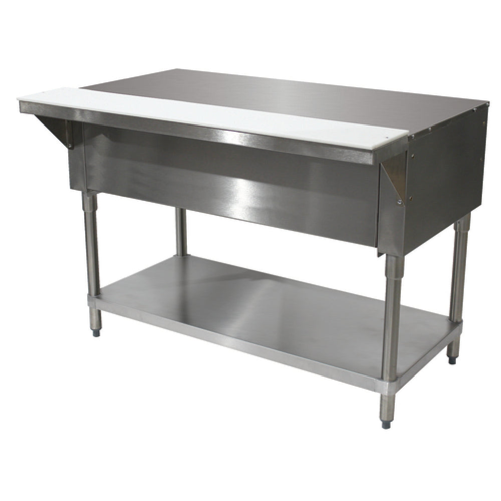Advance Tabco STU-2 Solid Top Table 31-13/16"W X 30-5/8"D X 34-3/8"H 20 Gauge 302 Stainless Steel Top With 8"D X 3/8" Thick Poly Cutting Board