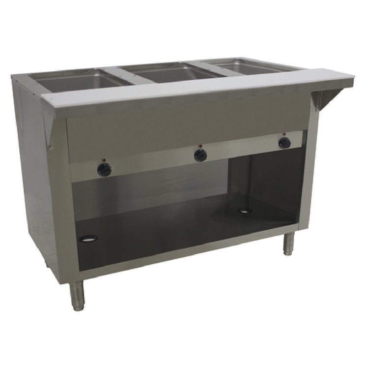 The Advance Tabco SW-3E-120-BS Hot Food Table Electric is a robust solution for commercial kitchens that require reliable food warming capabilities. With dimensions of 47-1/8"W x 30-5/8"D x 34-1/8"H, this electric hot food table is engineered to accommodate various operational needs. It features three 12" x 20" sealed wells, each fitted with individual drain valves, ideal for pan inserts up to 6" deep. This design ensures precise temperature control and easy maintenance, thanks to individual infinite controls complemented by indicator lights. The table is equipped with a 3/8" thick poly cutting board, providing a practical workspace for food preparation. Additionally, the open cabinet base includes a stainless steel undershelf, offering sturdy storage solutions. Constructed entirely from stainless steel, the table guarantees durability and longevity in demanding environments. The unit operates at 120v, ensuring compatibility with common electrical standards. Certified by UL and NSF, the Advance Tabco SW-3E-120-BS meets rigorous safety and sanitation standards, making it a dependable choice for restaurants, cafeterias, and catering services seeking efficient and hygienic food service equipment. This hot food table seamlessly combines functionality and reliability, catering to the diverse needs of the foodservice industry.