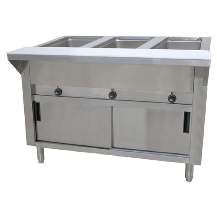 The Advance Tabco SW-3E-120-DR Hot Food Table - electric, with dimensions of 47-1/8"W x 30-5/8"D x 34-1/8"H, is engineered for food service professionals seeking efficiency and durability. This model comes equipped with three 12" x 20" sealed wells, each with individual drain valves, accommodating pan inserts up to 6" deep, making it adaptable for various food holding needs. The individual infinite controls with indicator lights allow precise temperature management for each well, ensuring optimal food quality. A 3/8" thick poly cutting board provides a convenient workspace, enhancing kitchen productivity. The unit features an enclosed base with two sliding doors for secure storage, balancing accessibility with space conservation. Crafted from stainless steel, this hot food table is built to withstand rigorous environments. Certified by UL and NSF, it adheres to stringent safety and sanitation standards. Operating at 120 volts, it is suitable for establishments ranging from small eateries to large-scale catering operations, ensuring versatile application across the food service industry.