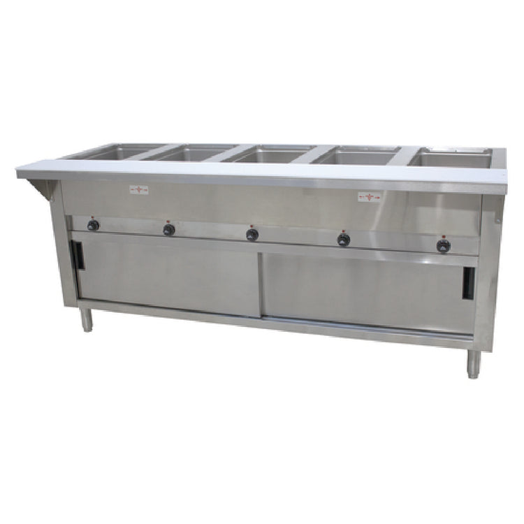 The Advance Tabco SW-5E-240-DR Hot Food Table Electric 77-3/4"W X 30-5/8"D X 34-1/8"H is a versatile and robust solution for maintaining food temperatures in a commercial kitchen setting. This electric hot food table is equipped with five 12" x 20" sealed wells, each featuring individual drain valves, accommodating pan inserts up to 6" deep. The table includes individual infinite controls with indicator lights, allowing precise temperature management for each well. Constructed with a durable stainless steel body, it ensures longevity and easy maintenance. The table also incorporates a 3/8" thick poly cutting board, providing a convenient surface for food preparation. An enclosed base with two sliding doors offers additional storage space, optimizing kitchen operations. Certified by UL and NSF, this product complies with rigorous safety and sanitation standards, making it suitable for various food service environments. Operating at 208-240 volts, the Advance Tabco SW-5E-240-DR Hot Food Table is designed to meet the needs of restaurants, cafeterias, and catering services, where efficiency and reliability are paramount. This product is a practical and efficient asset across the food service industry, offering flexibility and high performance in temperature management.