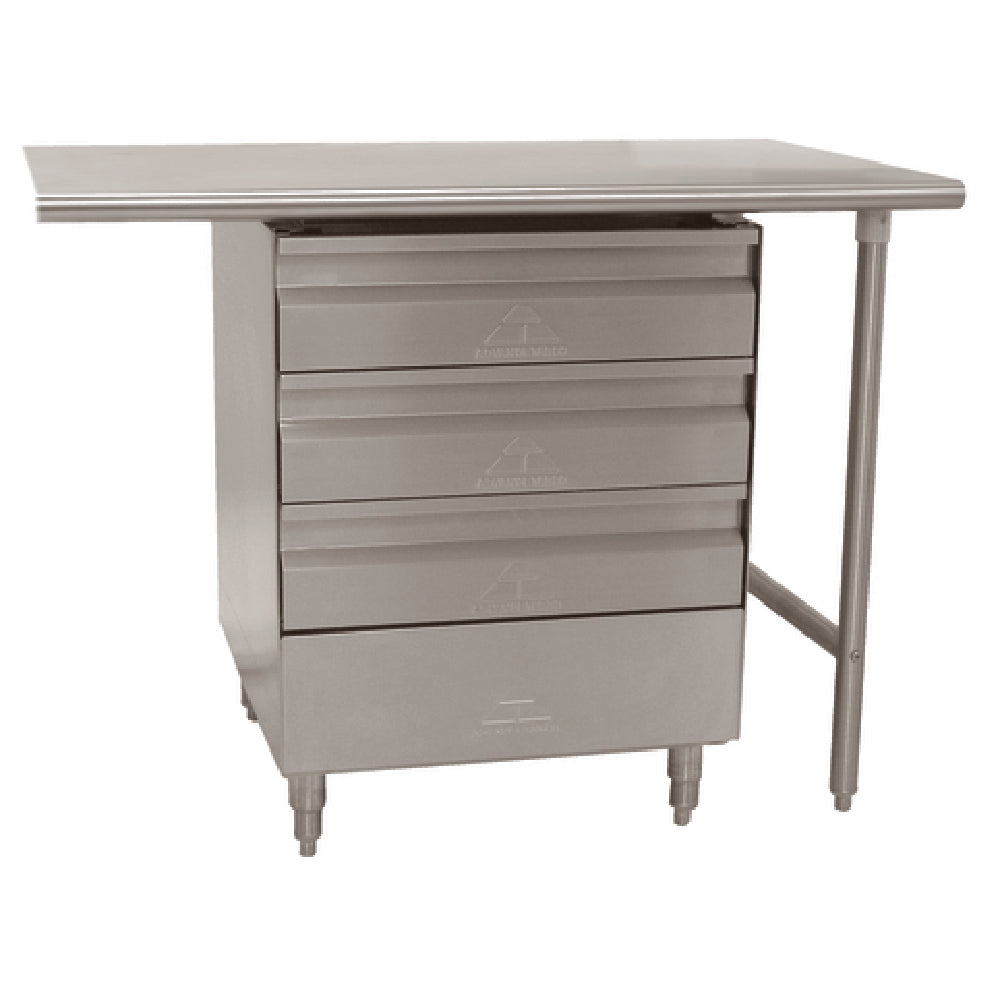 The Advance Tabco TA-38 Drawer Assembly is a meticulously designed unit featuring a three-tier configuration, each drawer measuring 20 inches in width, 20 inches in depth, and 5 inches deep, complete with removable stainless steel drawer inserts. This assembly stands out for its roller bearing drawer slides, enabling smooth operation, and self-closing drawers with noise control for a quieter environment. Concealed side panels provide a sleek and streamlined appearance, while its construction from 430 stainless steel ensures durability and resistance to corrosion. The assembly is all TIG welded and comes fully assembled, emphasizing structural integrity and ease of installation. Equipped with four stainless steel legs, it offers stability, with 1/2-inch adjustable hex feet to accommodate uneven surfaces. This product is ideal for use in commercial kitchens, laboratories, and medical facilities where robust, reliable, and hygienic storage solutions are necessary. The combination of high-quality materials and thoughtful design makes the Advance Tabco TA-38 Drawer Assembly a versatile choice for professionals seeking efficiency and long-lasting performance in demanding environments.