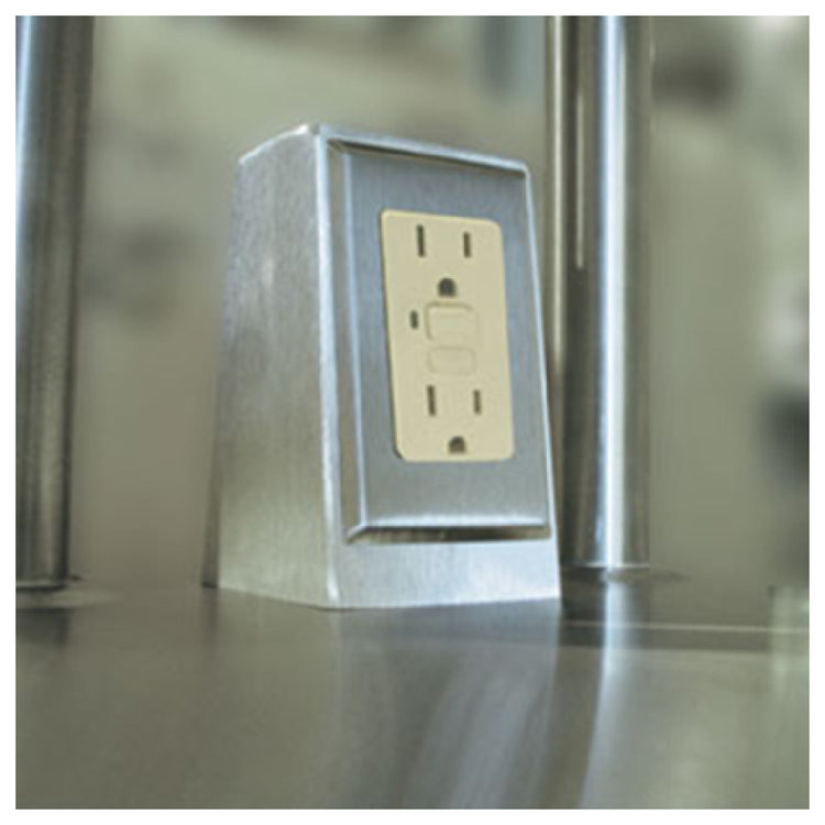 The Advance Tabco TA-62D Electric Outlet In Doghouse Box On Top Of Table Or Overshelf is an innovative solution for enhancing electrical accessibility in various commercial settings. Engineered with a GFI duplex design, this product is housed in a distinctive 'doghouse-style' single gang box, providing a compact and secure electrical setup. It features NEMA 5-20R receptacles, ensuring compatibility with a broad range of electrical devices. The stainless face plate not only adds durability but also maintains a sleek, professional appearance suitable for any modern kitchen or industrial workspace. It supports a maximum of 120v 20A service, sufficient for powering multiple standard appliances and tools simultaneously. However, it is important to note that the wiring and utility chases or provisions are not included, necessitating additional installation considerations. This product is particularly valuable for businesses that require reliable electrical connections in constrained spaces, such as food service operations, laboratories, or manufacturing environments. By integrating the Advance Tabco TA-62D into existing setups, establishments can enhance their operational efficiency, making it a practical choice for those seeking dependable and robust electrical solutions in busy professional settings.