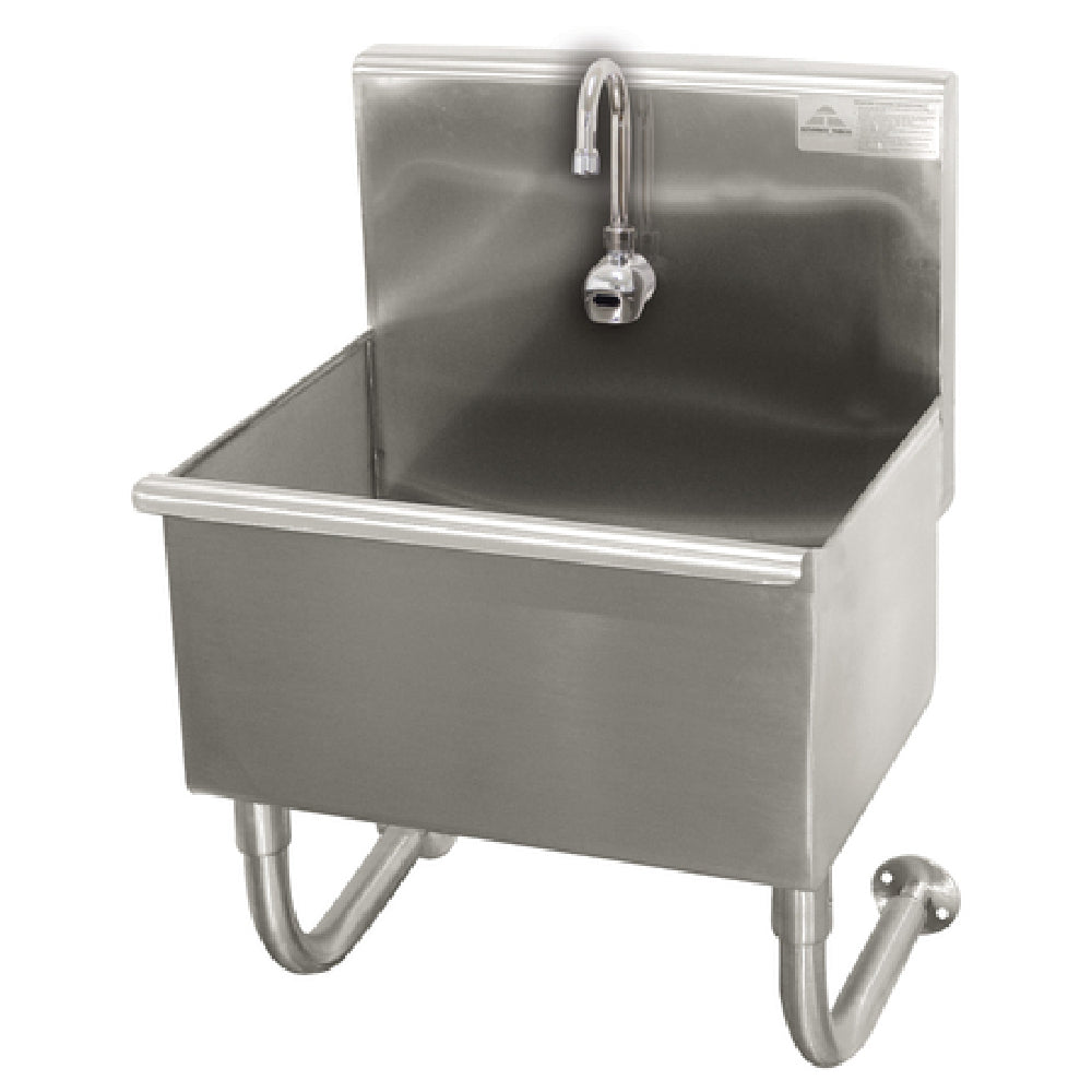 The Advance Tabco WSS-14-21EF Service Sink Splash Mount Faucet Provision Wall Mounted is a highly specialized unit designed for efficiency and durability in service environments. Measuring an overall dimension of 18 inches in width, 17-1/2 inches in depth, and 32-1/2 inches in height, it is engineered to meet the demands of various industrial and commercial settings. The sink features an 18-inch wide by 14-inch front-to-back by 12-inch deep bowl, offering ample space for a range of cleaning tasks. With an 8-1/2-inch high backsplash, it provides significant splash protection, enhancing cleanliness and preventing water damage to surrounding areas. This unit includes a single faucet hole and comes equipped with electronic faucet provision, adding convenience and modern functionality. Constructed from 16 gauge 304 stainless steel, it promises excellent resistance to corrosion and long-lasting performance. The inclusion of tubular wall brackets ensures secure and stable wall mounting, maximizing workspace efficiency. Additionally, the 3-1/2-inch basket drain facilitates effective waste management, contributing to a cleaner working environment. The Advance Tabco WSS-14-21EF is a versatile choice suitable for various segments within the food service and sanitation industries, where reliability and high performance are paramount.