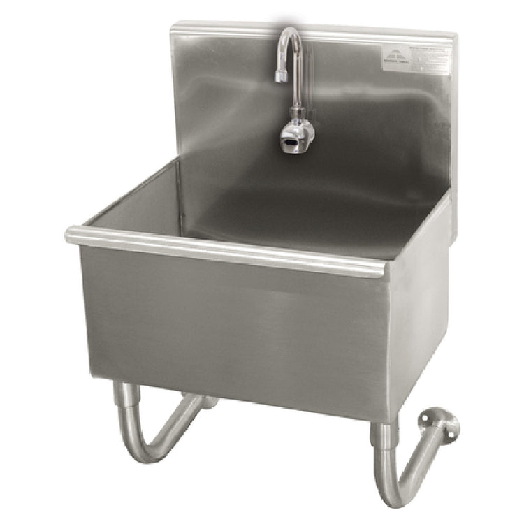 The Advance Tabco WSS-16-31EF Service Sink is a meticulously engineered unit designed for versatile use in various industrial segments, particularly where hygiene and durability are paramount. This wall-mounted sink features a splash mount faucet provision enhanced by an electronic faucet, optimizing both functionality and modern technology. Its dimensions - 31 inches wide, 16 inches deep, and an overall height of 32-1/2 inches - accommodate a robust 31-inch width by 16-inch front-to-back by 12-inch deep bowl. The sink's design includes an 8-1/2-inch high backsplash, which effectively prevents splashes and maintains cleanliness. Constructed from high-quality 16 gauge 304 stainless steel, this sink is built to withstand rigorous use while ensuring longevity and resistance to corrosion. A single faucet hole and tubular wall brackets provide straightforward installation and stability. The inclusion of a 3-1/2-inch basket drain further underscores its practicality, facilitating efficient drainage. This sink is ideal for settings requiring frequent and robust cleaning capabilities, such as commercial kitchens, laboratories, and healthcare facilities, providing a reliable solution tailored to meet the demanding needs of professionals in these environments.