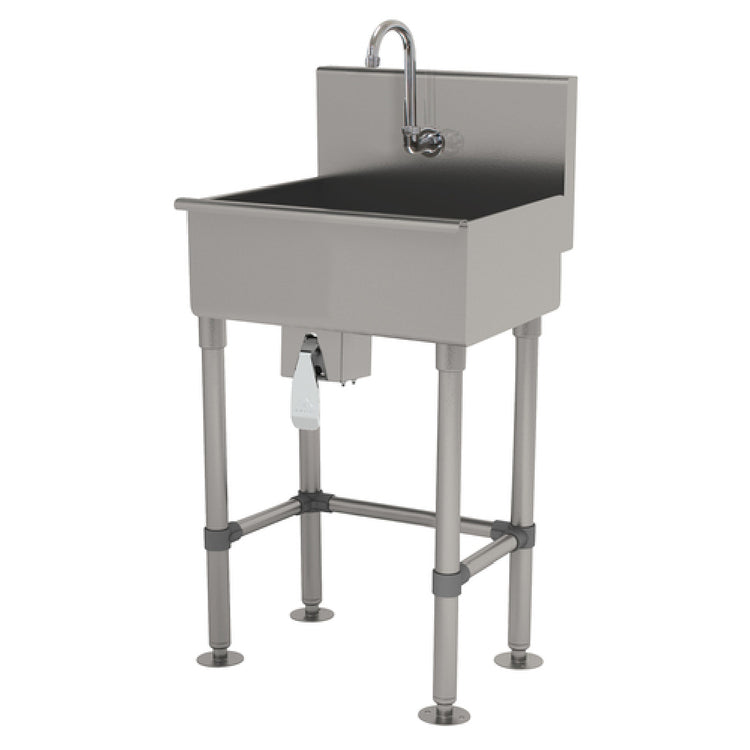 The Advance Tabco WSS-16-31FV-FM Service Sink Splash Mount Faucet Provision Floor Model is a meticulously designed utility fixture, ideal for commercial and industrial environments requiring robust and efficient service sinks. This floor model features a toe-operated push valve, providing hands-free operation that enhances hygiene and convenience. With dimensions of 31 inches wide, 16 inches front-to-back, and an overall height of 42-1/2 inches, this sink offers ample space for a variety of cleaning tasks. Its bowl depth of 12 inches and the inclusion of an 8-1/2 inch high backsplash ensures effective splash protection. The sink is equipped with a single faucet hole and a gooseneck spout, providing flexibility in water delivery options. Constructed from durable 16-gauge 304 stainless steel, it promises longevity and resistance to corrosion, crucial for demanding settings. Supporting the structure are stainless steel legs with flanged feet and a pedal bracket support, ensuring stability and ease of use. Additionally, it comes with a 3-1/2 inch basket drain, facilitating efficient wastewater management. This service sink is particularly suitable for sectors such as hospitality, healthcare, and maintenance, where high-performance cleaning stations are essential for operational efficiency and cleanliness.