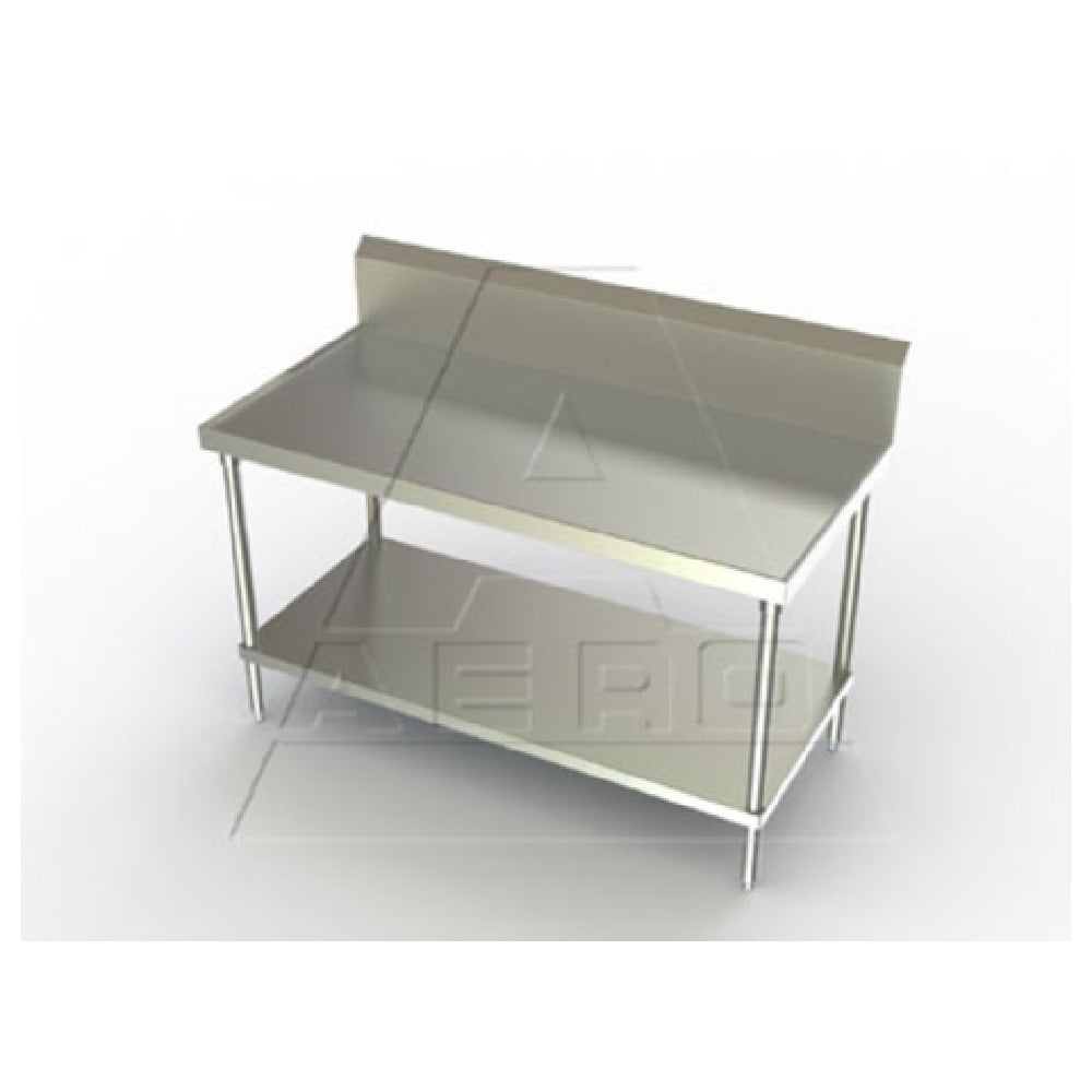 The AERO Manufacturing 1TSB-24144 Aerospec™ Work Table is a robust, high-quality unit designed to meet the demanding needs of various industry sectors. Featuring a substantial 144-inch width, 24-inch depth, and 45-inch height, this work table is constructed with a 14-gauge 304 stainless steel top, ensuring durability and resistance to corrosion. The table incorporates two stainless steel box channels, providing additional structural support for rigorous tasks. A 10-inch backsplash with a 2-inch return is integrated to help maintain cleanliness and prevent spillage. The front and side edges feature marine design edges for added safety and functionality. The underside of the table is sound deadened, minimizing noise during use. Additionally, it includes an 18-gauge 430 stainless steel adjustable undershelf, offering versatile storage options. The stainless steel gussets and 16-gauge 304 stainless steel legs with adjustable feet ensure stability on uneven surfaces. The Aero Hemmed Safety Edge™ enhances user safety. Shipped in a knockdown format, this unit is NSF certified, emphasizing its adherence to public health and safety standards. This versatile work table is an ideal choice for professional kitchens, laboratories, and industrial environments that require reliable and efficient workspace solutions.
