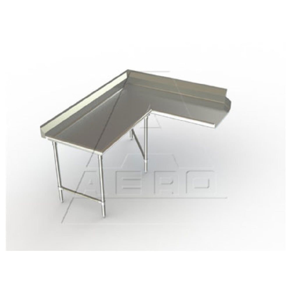 The AERO Manufacturing 2CDC-L-144 Aerospec™ Clean Dishtable Corner Design 60-inch Machine to Corner is a meticulously crafted solution for efficient kitchen operations, specifically tailored for right-to-left workflow. Engineered with a 14/304 stainless steel top, this dishtable ensures both durability and resilience. The design integrates a 10-inch backsplash with a 2-inch sanitary return, providing enhanced cleanliness and ease of maintenance. Measuring 144 inches from corner to end with a 30-inch working depth, it offers ample space for handling and sorting dishware. The table stands at 43 inches high, accommodating ergonomic use. Its raised rolled edges and fully welded stainless steel gussets contribute to a robust and reliable structure. The table is supported by 16/304 stainless steel legs with adjustable stainless steel feet and crossbracing, ensuring stability on uneven surfaces. The addition of the Aero Hemmed Safety Edge™ further enhances safety during operation. Designed to meet rigorous standards, this dishtable is NSF certified, making it an ideal choice for commercial kitchens that prioritize hygiene and efficiency. Its thoughtful corner design optimizes space, making it particularly valuable for operations needing to maximize kitchen layouts without compromising on functionality or quality.