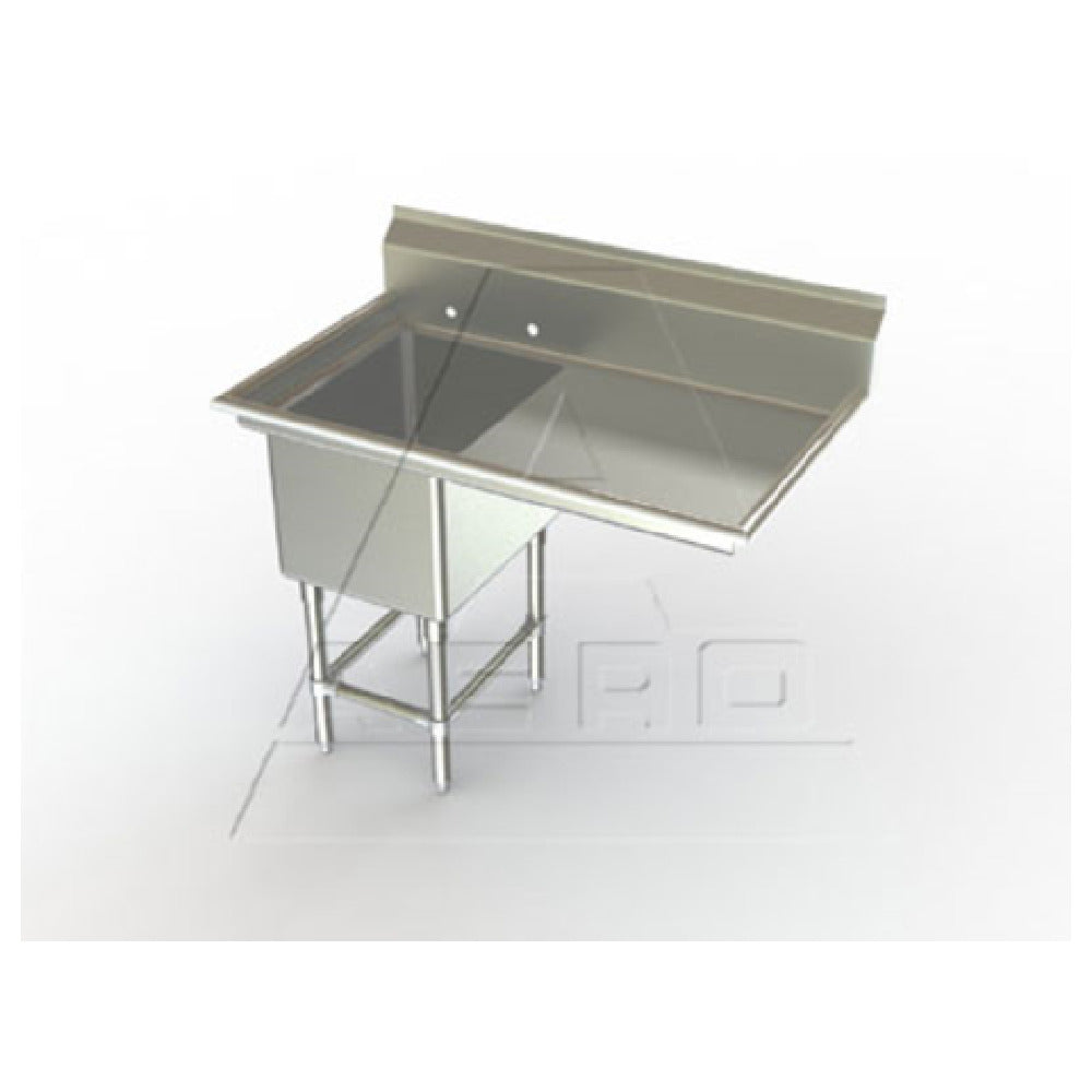AERO Manufacturing 2F1-2424-24R Aerospec™ Sink One Compartment 52-1/3"W X 30"D X 42-1/2"H is a premium-grade sink designed for professional settings that demand durability and efficiency. Crafted from 14/304 stainless steel, the sink offers a robust, corrosion-resistant structure ideal for various industries, including foodservice and healthcare. It features a spacious 24" x 24" x 14" deep compartment, providing ample space for washing and preparation tasks. The 24" drainboard on the right enhances functionality, facilitating easy drainage and workflow efficiency. The sink is equipped with a 10"H backsplash to protect walls from water splashes, while the 8" OC splash mount faucet holes ensure compatibility with standard plumbing fixtures. Raised rolled edges on the front and sides prevent spills and improve safety. Fully welded stainless steel gussets and 16/304 stainless steel legs with front and side cross bracing offer unmatched stability. Adjustable stainless steel feet allow for height customization on uneven surfaces. Incorporating the Aero Hemmed Safety Edge™, this sink prioritizes user safety. The KD design ensures ease of assembly and installation. NSF certification guarantees compliance with health standards, making this sink a reliable choice for businesses seeking quality and performance.