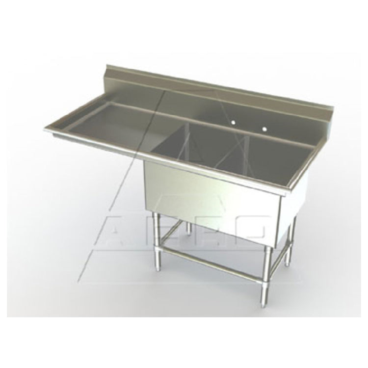 The AERO Manufacturing 2F2-2418-18L Aerospec™ Sink Two Compartment 58-1/4"W x 30"D x 42-1/2"H is a meticulously crafted kitchen utility, optimized for commercial use. Constructed from durable 14/304 stainless steel, this sink features two 18"W x 24" front-to-back x 14" deep fabricated compartments, accommodating various kitchen tasks with ease. An 18" drainboard on the left provides additional workspace, enhancing efficiency. The sink is equipped with a 10"H backsplash and 8" OC splash mount faucet holes, ensuring ease of installation and preventing water spillage. Raised rolled edges on the front and sides contribute to safety and water containment. Fully welded stainless steel gussets and 16/304 stainless steel legs with front and side cross bracing ensure structural integrity, while adjustable stainless steel feet facilitate stability on uneven surfaces. The Aero Hemmed Safety Edge™ is a notable design feature, prioritizing user safety. This sink meets NSF standards, making it a reliable choice for maintaining hygiene in professional settings. With its comprehensive design and high-quality materials, the AERO Manufacturing 2F2-2418-18L Aerospec™ Sink is an invaluable asset for restaurants, catering services, and other industries requiring robust, efficient kitchen solutions.