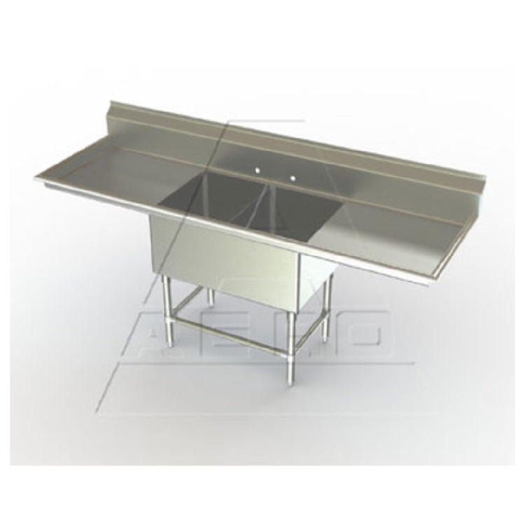 The AERO Manufacturing 2F2-2418-18LR Aerospec™ Sink Two Compartment 75"W x 30"D x 42-1/2"H is a durable and versatile solution designed for diverse industrial applications. Constructed from 14/304 stainless steel, this sink features two spacious compartments, each measuring 18"W x 24" front-to-back x 14" deep, ensuring ample space for washing and rinsing tasks. The sink includes 18" drainboards on both the left and right sides, enhancing its utility and efficiency in busy environments. A 10"H backsplash provides protection against splashes, maintaining cleanliness and hygiene. Engineered with 8" OC splash mount faucet holes, the sink is ready for convenient faucet installation. Its design incorporates raised rolled edges on the front and sides to prevent spills and improve safety. The 16/304 stainless steel legs, reinforced with front and side cross bracing, offer stability, while adjustable stainless steel feet ensure a level setup on uneven surfaces. The fully welded stainless steel gussets enhance structural integrity, and the Aero Hemmed Safety Edge™ adds an extra layer of safety. This sink meets NSF standards, making it suitable for professional kitchens, restaurants, and food processing facilities seeking reliability and robust performance.