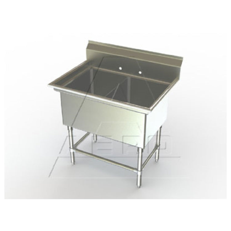 The AERO Manufacturing 2F2-2421 Aerospec™ Sink Two Compartment is a meticulously engineered piece of equipment measuring 47-1/2"W x 30"D x 42-1/2"H. Its robust 14/304 stainless steel construction ensures durability and longevity, making it an essential asset for commercial kitchens and foodservice environments. This sink features two fabricated compartments, each measuring 21" wide x 24" front-to-back x 14" deep, providing ample space for various washing and preparation tasks. The 10" high backsplash is designed to protect surrounding areas from water splashes, while 8" OC splash mount faucet holes offer flexibility for faucet installation. The raised rolled edges on the front and sides enhance safety and prevent spills. Fully welded stainless steel gussets contribute to its structural integrity. The sink is supported by 16/304 stainless steel legs equipped with front and side cross bracing, along with adjustable stainless steel feet for stability on uneven surfaces. Safety is a priority with the Aero Hemmed Safety Edge™. The unit is knock-down (KD) for convenient transport and assembly and is NSF certified, signifying adherence to rigorous health and safety standards. This versatile sink is designed to meet the demands of any professional kitchen, combining practicality with high-quality craftsmanship.