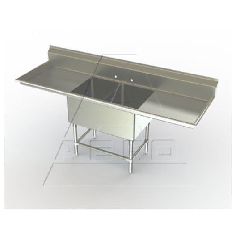 The AERO Manufacturing 2F2-3020-20LR Aerospec™ Sink is a robust, two-compartment sink designed for diverse commercial kitchen needs. Measuring 83 inches wide, 36 inches deep, and 42-1/2 inches high, this sink is meticulously crafted from 14/304 stainless steel, ensuring durability and longevity even in the most demanding environments. Each compartment is fabricated to a size of 20 inches wide by 30 inches front-to-back and 14 inches deep, providing ample space for washing and rinsing tasks. The design includes 20-inch drainboards on both the left and right sides, optimizing workspace efficiency. Featuring a 10-inch high backsplash and 8-inch on-center splash mount faucet holes, it promotes cleanliness and ease of use. The sink's raised rolled edges on the front and sides help contain spills, while fully welded stainless steel gussets and 16/304 stainless steel legs with front and side cross-bracing ensure stability. Adjustable stainless steel feet accommodate uneven surfaces. The Aero Hemmed Safety Edge™ enhances user safety. This knock-down (KD) unit is NSF certified, underscoring its compliance with health standards. The AERO Manufacturing 2F2-3020-20LR Aerospec™ Sink stands out for its functional design and superior build quality, catering to the exacting standards of professional kitchens across various sectors.