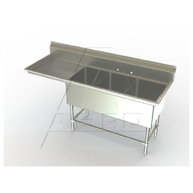 The AERO Manufacturing 2F3-3020-30L Aerospec™ Sink Three Compartment is a durable and versatile solution for a range of commercial kitchen environments. Measuring 94-1/4" in width, 36" in depth, and 42-1/2" in height, this sink is crafted from robust 14/304 stainless steel, ensuring long-lasting performance in demanding settings. It features three fabricated compartments, each 20" wide, 30" front-to-back, and 14" deep, providing ample space for various washing tasks. A 30" drainboard is conveniently located on the left side to facilitate efficient workflow. The sink's design includes a 10" high backsplash to protect walls from splashes and (2) sets of 8" OC splash mount faucet holes for easy installation. Raised rolled edges on the front and sides help contain spills, while fully welded stainless steel gussets add to its stability. Supporting the sink are 16/304 stainless steel legs with front and side cross bracing, along with adjustable stainless steel feet for a custom fit. The inclusion of Aero Hemmed Safety Edge™ enhances safety by minimizing sharp edges. NSF certification underscores its compliance with public health standards, making it a reliable choice for foodservice operations.