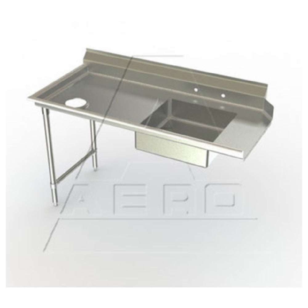 The AERO Manufacturing 2SD-L-48 Aerospec™ Soiled Dishtable is a straight design unit measuring 48 inches wide, 30 inches deep, and 43 inches high, perfect for commercial kitchens requiring efficient waste management solutions. Crafted with a 14-gauge 304 stainless steel top, this dishtable features exceptional durability and resistance to corrosion, ensuring long-lasting performance in demanding environments. It supports left-to-right operation, facilitating a streamlined workflow. The 10-inch high backsplash, complete with a 2-inch sanitary return, effectively contains splashes and maintains hygiene standards. It is equipped with 8-inch on-center splash mount faucet holes, providing compatibility with various pre-rinse faucets. The integrated fabricated pre-rinse sink measures 20 inches wide, 20 inches front-to-back, and 5 inches deep, designed for effective rinsing of soiled items. Its fully welded stainless steel gussets, 16-gauge 304 stainless steel legs, and side cross bracing enhance stability and structural integrity. Adjustable stainless steel feet ensure a level installation on uneven surfaces. The Aero Hemmed Safety Edge™ adds a layer of protection against sharp edges, prioritizing user safety. This unit comes knockdown (KD) for convenient assembly and is NSF certified, affirming its compliance with public health and safety standards, making it an ideal choice for diverse foodservice operations.