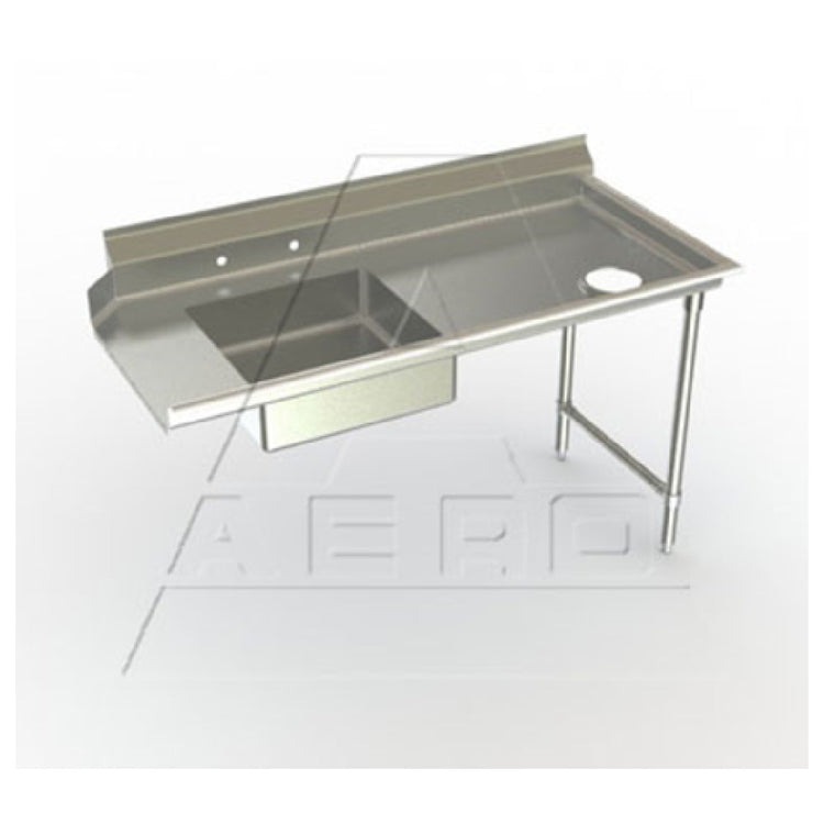 AERO Manufacturing 2SD-R-72 Aerospec™ Soiled Dishtable Straight Design 72"W X 30"D X 43"H stands out with its robust and practical design tailored for the foodservice industry. This soiled dishtable features a 14/304 stainless steel top, ensuring durability and resistance to corrosion, ideal for demanding kitchen environments. The straight design facilitates right-to-left operation, streamlining workflow in dishwashing areas. A 10"H backsplash with a 2" sanitary return helps maintain cleanliness, while the 8" OC splash mount faucet holes are designed for easy installation of pre-rinse faucets. The unit includes a 20" wide x 20" front-to-back x 5" deep fabricated pre-rinse sink, providing ample space for rinsing and pre-washing tasks. Fully welded stainless steel gussets, along with 16/304 stainless steel legs and side cross bracing, offer exceptional stability and support. Adjustable stainless steel feet ensure that the table remains level on uneven surfaces. Featuring the Aero Hemmed Safety Edge™, this dishtable prioritizes user safety by minimizing sharp edges. Designed with knock-down (KD) construction, it allows for straightforward assembly and installation. Certified by NSF, this dishtable meets rigorous public health standards, making it a reliable choice for commercial kitchens and foodservice establishments.