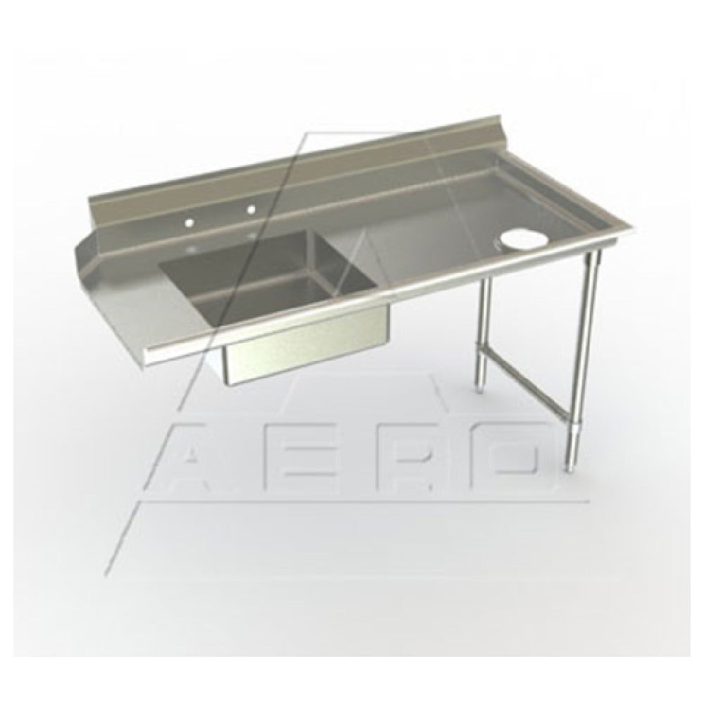 The AERO Manufacturing 2SD-R-84 Aerospec™ Soiled Dishtable is a meticulously designed piece of equipment tailored for the efficient handling of soiled dishware in commercial kitchens. With its straight design, this model measures 84 inches in width, 30 inches in depth, and stands 43 inches tall, providing ample space for dish handling tasks. Crafted from durable 14/304 stainless steel, the top surface ensures a robust and sanitary workspace, further complemented by a 10-inch backsplash featuring a 2-inch sanitary return to manage splashes. The right-to-left operation is optimized by an 8-inch on-center splash mount faucet hole configuration. The integrated pre-rinse sink, measuring 20 inches wide, 20 inches front-to-back, and 5 inches deep, enhances functionality, facilitating efficient pre-cleaning processes. Ensuring stability, the unit is supported by fully welded stainless steel gussets and 16/304 stainless steel legs with side cross bracing, accompanied by adjustable stainless steel feet for precise leveling. The Aero Hemmed Safety Edge™ adds an extra layer of security, preventing accidental injuries. Certified by NSF, this dishtable aligns with stringent public health standards, making it an indispensable asset for various segments in the foodservice industry, from large-scale food operations to smaller establishments seeking robust and hygienic dishwashing solutions.
