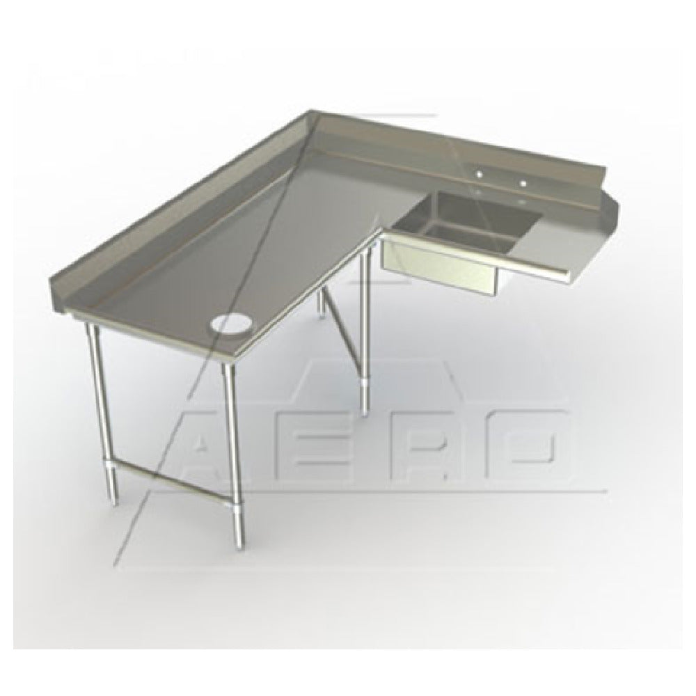 The AERO Manufacturing 2SDC-L-96 Aerospec™ Soiled Dishtable Corner Design 60" Machine To Corner is a meticulously engineered solution for efficient dishwashing operations in commercial kitchens. This unit features a corner design with a 60" transition from machine to corner and extends 96" from the corner to the end, providing ample space for handling soiled dishes. With a working depth of 30" and a height of 43", it accommodates left-to-right operation, optimizing workflow in busy environments. Constructed with a 14/304 stainless steel top, it ensures durability and resistance to corrosion, while the 10" high backsplash with a 2" sanitary return aids in maintaining cleanliness. The table is equipped with 8" OC splash mount faucet holes and a 20" wide x 20" front-to-back x 5" deep fabricated pre-rinse sink for efficient pre-wash tasks. Fully welded stainless steel gussets and 16/304 stainless steel legs with side cross bracing offer robust support, enhanced by adjustable stainless steel feet for stability. The Aero Hemmed Safety Edge™ ensures user safety during operation. Designed to meet NSF standards, this corner dishtable is an ideal choice for various segments within the food service industry, providing reliability and efficient space utilization.