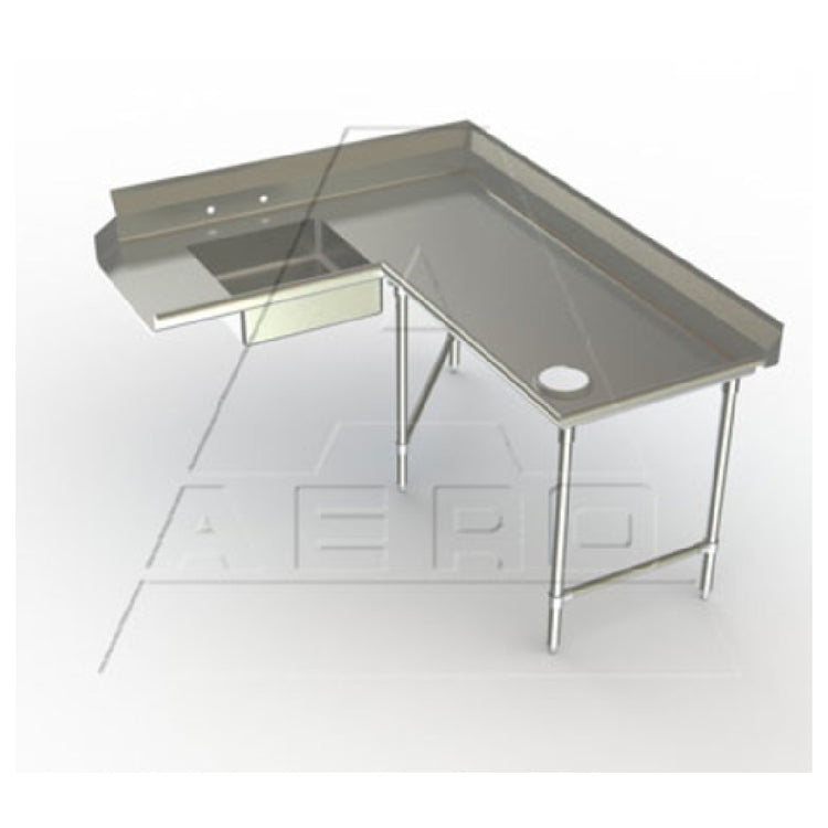 The AERO Manufacturing 2SDC-R-120 Aerospec™ Soiled Dishtable Corner Design 60" Machine To Corner is engineered to optimize dishwashing processes in commercial kitchens with its innovative corner design. This dishtable features a length of 60 inches from the machine to corner and extends 120 inches from corner to end, providing ample space for efficient workflow. With a working depth of 30 inches and a height of 43 inches, it supports right-to-left operation, which is ideal for streamlined kitchen layouts. The table is crafted with a 14-gauge, 304 stainless steel top, ensuring durability and resistance to corrosion. A 10-inch high backsplash with a 2-inch sanitary return prevents spillage and maintains cleanliness. It includes 8-inch on-center splash mount faucet holes for easy installation of plumbing fixtures. The integrated pre-rinse sink measures 20 inches wide by 20 inches front-to-back, with a 5-inch depth, providing a practical solution for pre-washing dishes. Fully welded stainless steel gussets, paired with 16-gauge, 304 stainless steel legs and side cross bracing, offer exceptional stability. Adjustable stainless steel feet ensure the table remains level on uneven surfaces. The Aero Hemmed Safety Edge™ enhances user safety by minimizing sharp edges. This unit is NSF certified, affirming its compliance with sanitation standards.