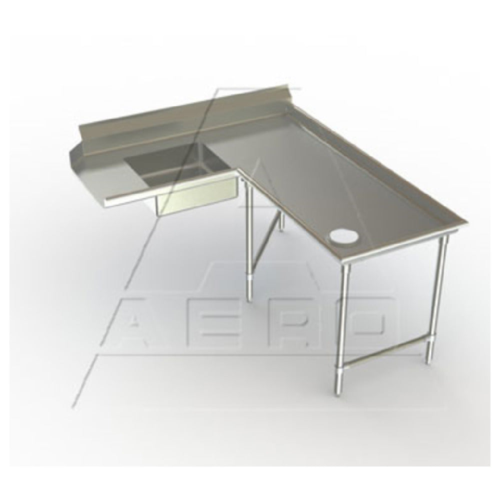 The AERO Manufacturing 2SDI-R-60 Aerospec™ Soiled Dishtable is an island design that serves as an efficient solution for commercial kitchens, particularly those incorporating a 60-inch machine to corner setup. This unit features a 60-inch corner to end configuration, complemented by a 30-inch working depth and a 43-inch height, ensuring compatibility with diverse kitchen layouts. Designed for right-to-left operation, it boasts a durable 14-gauge 304 stainless steel top, known for its exceptional resistance to corrosion. The 10-inch high backsplash with a 2-inch sanitary return enhances hygiene by preventing debris accumulation. Additionally, it includes 8-inch on-center splash mount faucet holes, accommodating standard plumbing requirements. The integrated pre-rinse sink, measuring 20 inches wide, 20 inches front-to-back, and 5 inches deep, facilitates efficient dishwashing processes. To ensure stability and durability, the dishtable incorporates fully welded stainless steel gussets and 16-gauge 304 stainless steel legs with side cross bracing. Adjustable stainless steel feet provide flexibility for uneven surfaces. The Aero Hemmed Safety Edge™ ensures safety by eliminating sharp edges. This unit is designed for knock-down (KD) assembly, enhancing ease of transport and installation. Certified by NSF, it meets high standards for public health protection, making it an excellent choice for professional food service environments.