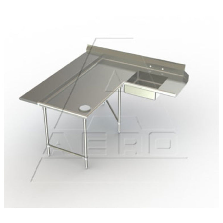 The AERO Manufacturing 2SDL-L-84 Aerospec™ Soiled Dishtable Island Design 72" Machine To Corner is a precision-engineered solution tailored for commercial kitchens requiring efficient waste management and cleaning systems. This island-style dishtable features a 72" machine to corner configuration, extending 84" from corner to end, with a substantial 30" working depth and a height of 43". Designed for left-to-right operation, it boasts a 14-gauge, 304 stainless steel top, ensuring durability and resistance to corrosion. The 10" high backsplash with a 2" sanitary return helps maintain a clean and hygienic workspace. For added convenience, the dishtable includes 8" OC splash mount faucet holes and a 20" x 20" x 5" deep fabricated pre-rinse sink. An additional 84"W x 12"D landing shelf is integrated, providing ample space for temporary storage. The structure is reinforced with fully welded stainless steel gussets and supported by 16-gauge, 304 stainless steel legs and side cross bracing. Adjustable stainless steel feet ensure stability on uneven surfaces. The Aero Hemmed Safety Edge™ design enhances safety during use. It is KD and NSF certified, affirming its quality and compliance with health and safety standards, making it a reliable choice for food service operations.
