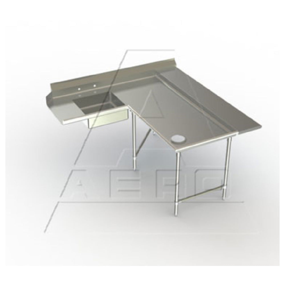The AERO Manufacturing 2SDL-R-48 Aerospec™ Soiled Dishtable is a versatile island-design solution, catering to diverse kitchen environments with its 72-inch machine-to-corner and 48-inch end-to-corner configuration. This soiled dishtable features a substantial 30-inch working depth and stands at 43 inches high, supporting right-to-left operation. Its construction showcases a top crafted from 14-gauge, 304 stainless steel, ensuring durability and resistance against corrosion. A practical 10-inch backsplash with a 2-inch sanitary return is included, alongside 8-inch on-center splash mount faucet holes for ease of installation. Complementing its functionality is a 20-inch wide by 20-inch front-to-back by 5-inch deep fabricated pre-rinse sink, ideal for efficient cleaning processes. An additional 48-inch wide by 12-inch deep landing shelf provides extra space for workflow optimization. The assembly is reinforced with fully welded stainless steel gussets and supported by 16-gauge, 304 stainless steel legs and side cross bracing. The adjustable stainless steel feet ensure stability on uneven surfaces, while the Aero Hemmed Safety Edge™ enhances safety during use. Designed in knockdown format (KD) for straightforward setup, this soiled dishtable is NSF certified, marking its adherence to rigorous health and safety standards, making it a valuable asset in commercial kitchen setups.