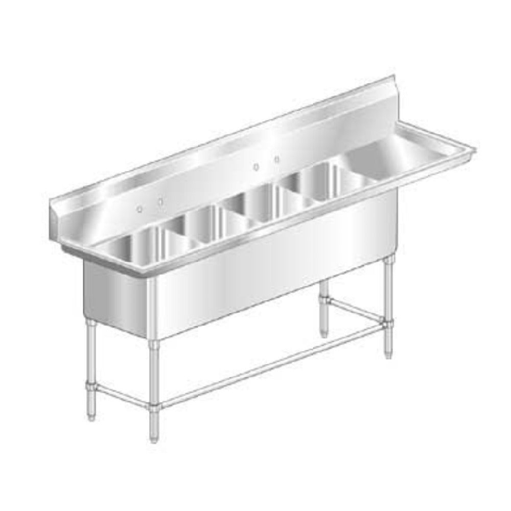 The AERO Manufacturing 3F4-2116-24R Delux™ Sink Four Compartment with 24" Drainboard on Right is a meticulously engineered kitchen solution designed for efficiency and durability in commercial settings. This sink features four compartments, each with a bowl dimension of 21 inches wide by 16 inches long and a depth of 14 inches, allowing for versatile use in diverse culinary environments. Accompanied by a 24-inch drainboard positioned on the right, it enhances workspace organization and functionality. Crafted from 16-gauge, 300 series stainless steel, this sink is robust and resistant to corrosion, ensuring longevity in demanding kitchen operations. Its space saver construction is ideal for optimizing kitchen layouts, while the fully welded stainless steel gussets and Aero Hemmed Safety Edge™ provide additional stability and safety. The sink is supported by strong stainless steel legs with adjustable white metal feet, maintaining balance on uneven surfaces. A 7-inch high splash guard reduces the risk of water damage to surrounding areas, enhancing hygiene and maintenance. Shipped KD (knocked down) for convenient assembly and transportation, this unit is NSF certified, verifying its adherence to health and safety standards. This sink is a premium choice for ensuring seamless kitchen operations across various segments of the food service industry.