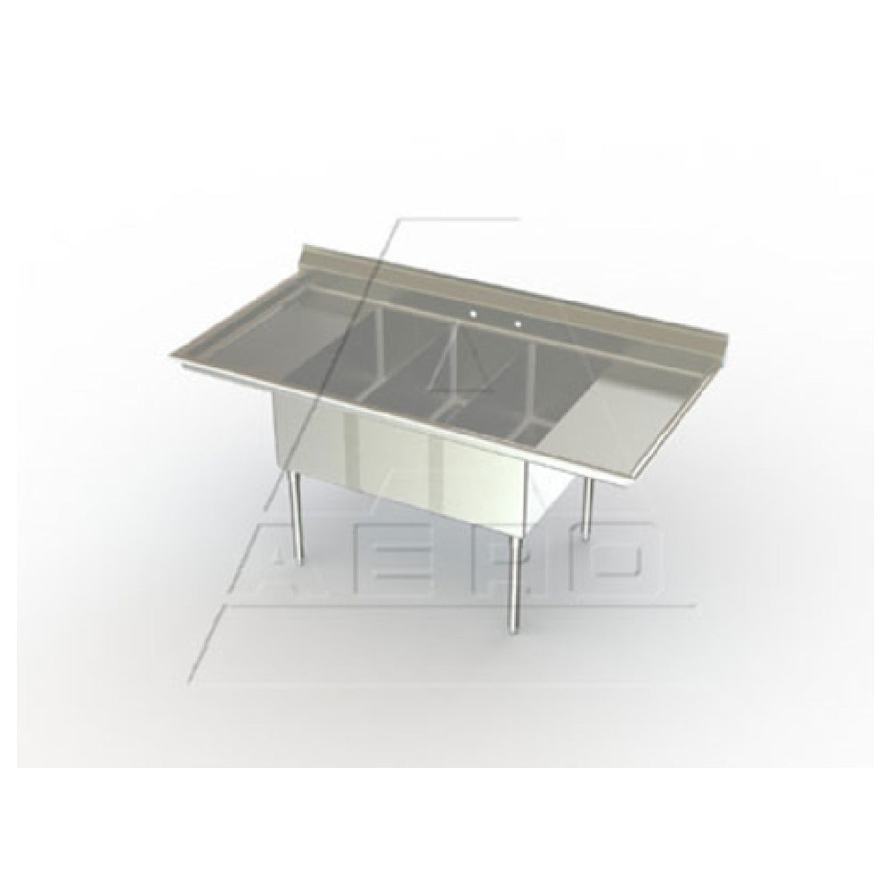 The AERO Manufacturing 3MP-3-15LR Supermarket Sink Meat & Platter Three Compartment is a highly functional and versatile unit designed to meet the stringent demands of supermarket and commercial kitchen environments. This well-crafted sink features three separate compartments, each with a 14-inch deep bowl, providing ample space for washing and handling meat and platters. Its dimensions of 32 inches wide and 12 inches long from left to right make it suitable for various kitchen setups. Equipped with 15-inch drainboards on both the left and right, it offers additional convenience for efficient workflow. The sink is constructed with 16 gauge 300 series stainless steel, known for its durability and resistance to corrosion. Stainless steel gussets and legs ensure stability, while adjustable white metal feet provide flexibility in installation. The unit also includes a 7-inch high splash guard to maintain cleanliness and prevent spillage. AERO Hemmed Safety Edge enhances user safety during operation. Shipped KD (knocked down) for easy assembly and installation, this sink is NSF certified, ensuring compliance with public health and safety standards. The AERO Manufacturing 3MP-3-15LR is an indispensable asset for any food service operation, combining practicality with reliability.