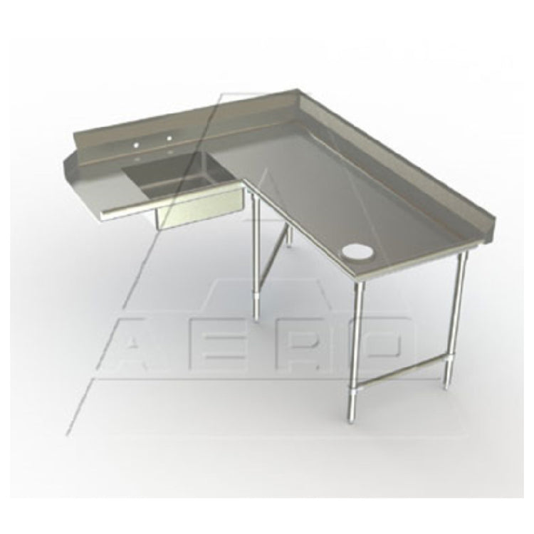 The AERO Manufacturing 3SDC-R-144 Delux™ Soiled Dishtable Corner Design 60" Machine To Corner is a precision-engineered unit essential for commercial kitchens requiring efficient dish handling and sanitation processes. Designed with a 60" machine to corner specification, it extends 144" from corner to end, offering ample space for operations. The unit features a 30" working depth and stands at a height of 40", facilitating a right-to-left workflow that is ideal for ergonomic kitchen configurations. Constructed with a 16/304 stainless steel top, this dishtable ensures durability and resistance to corrosion. It includes a 7" high backsplash with a 2" sanitary return, enhancing cleanliness in demanding environments. The table integrates 8" OC splash mount faucet holes and a 20" wide, 20" front-to-back, and 5" deep fabricated pre-rinse sink for efficient pre-washing. Stability is assured with fully welded stainless steel gussets and 16/304 stainless steel legs with side cross bracing. Adjustable white metal feet accommodate uneven surfaces, while the Aero Hemmed Safety Edge™ minimizes injury risk. The unit is NSF certified, underscoring its compliance with health standards, making it a reliable choice for restaurants, cafeterias, and other food service operations seeking efficiency and quality.