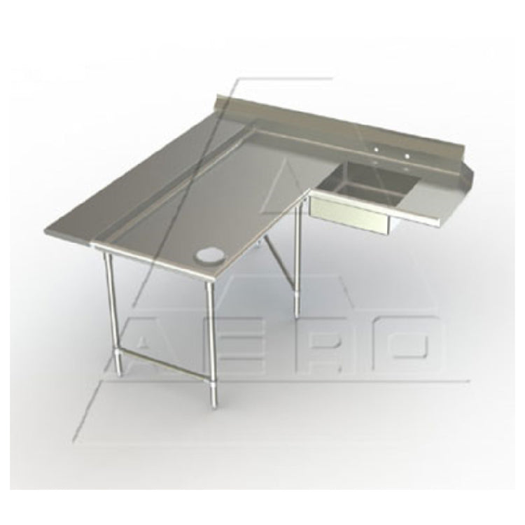 The AERO Manufacturing 3SDL-L-96 Delux™ Soiled Dishtable Island Design 72" Machine To Corner is a meticulously engineered piece crafted for the food service industry, characterized by its robust 16/304 stainless steel construction. This island design dishtable measures 72 inches from the machine to the corner and extends 96 inches from the corner to the end, with a working depth of 30 inches and a height of 40 inches, facilitating an efficient left-to-right operation. The 7-inch high backsplash with a 2-inch sanitary return, accompanied by 8-inch on-center splash mount faucet holes, underscores its commitment to hygiene and ease of use. The integrated 20-inch wide, 20-inch front-to-back, and 5-inch deep fabricated pre-rinse sink is complemented by a 96-inch wide by 12-inch deep landing shelf, offering ample workspace. Its fully welded stainless steel gussets, along with 16/304 stainless steel legs and side cross bracing, ensure durability and stability. The adjustable white metal feet and Aero Hemmed Safety Edge™ add to the functionality and safety of this unit. Certified by NSF, this dishtable is a versatile and indispensable asset for commercial kitchens looking for reliable and efficient dishwashing solutions.