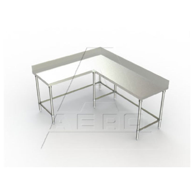 The AERO Manufacturing 3TCBX-6060 Delux™ Corner Table is meticulously engineered to meet the diverse demands of industrial and commercial environments. This corner table has dimensions of 60"L x 60"W and features a 24" working depth, making it an ideal choice for maximizing workspace efficiency. The table is constructed with a 16 gauge 300 series stainless steel top, ensuring durability and resistance to corrosion, which is crucial for maintaining hygiene standards. For added stability, the table includes three galvanized steel box channels and is supported by stainless steel legs with side and rear crossbracing. The 1-7/8" turn down on the front and sides and the 4"H backsplash offer additional protection and cleanliness. The fully welded gussets and Aero Hemmed Safety Edge™ enhance the table’s robustness and safety, making it a reliable choice for various industrial applications. Sound deadening features minimize noise, contributing to a more pleasant working environment. The table also includes white metal feet for stable placement. Shipped knocked down (KD) for cost-effective transportation and ease of assembly, the table is NSF certified, confirming its compliance with health and safety regulations. This corner table is a versatile and invaluable asset for restaurants, laboratories, and manufacturing sectors.