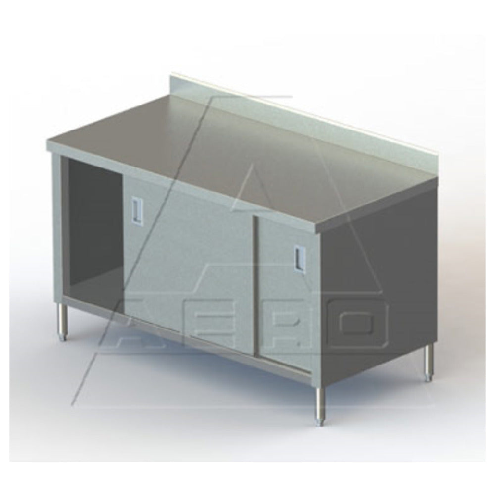 The AERO Manufacturing 3TSBOD-2496 Delux™ Work Table Cabinet Base With Sliding Doors is a high-quality piece of equipment engineered for professional environments. Measuring 96 inches wide, 24 inches deep, and 39 inches high, it is designed to accommodate various workspace needs. The table features a 16-gauge, 304 stainless steel top, reinforced with two galvanized steel box channels for added stability. A 4-inch backsplash is included for spill protection, while the sound-deadened underside minimizes noise during use. The cabinet base includes two 18-gauge, 430 stainless steel sliding doors equipped with integral handles and nylon roller bearing sheaves for smooth operation. The cabinet body and undershelf are also constructed from 18-gauge, 430 stainless steel, ensuring durability and resistance to corrosion. Supporting the structure are legs made of 16-gauge, 304 stainless steel with adjustable white metal feet for stability on uneven surfaces. The Aero Hemmed Safety Edge™ ensures user safety by providing smooth edges. Shipped in a KD (knocked down) format, it is built for easy assembly and installation. NSF certification guarantees that this work table meets strict standards for public health protection, making it an excellent choice for a variety of professional settings, including kitchens and laboratories.