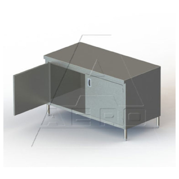 The AERO Manufacturing 3TSOHD-2496 Delux Work Table Cabinet Base with Hinged Doors is meticulously crafted to meet the needs of high-demand industries requiring robust workspaces. This unit stands out with its expansive dimensions of 96"W x 24"D x 35"H, providing ample surface area for a variety of applications. The table is engineered with a 16/304 stainless steel top, which is reinforced with two galvanized steel box channels, ensuring strength and durability. The sound-deadened underside minimizes noise, making it ideal for environments where sound control is crucial. The cabinet features two 18/430 stainless steel hinged doors, equipped with integral handles and stainless steel piano hinges, allowing for smooth operation and enhanced accessibility. The cabinet body and undershelf are also constructed with 18/430 stainless steel, providing additional storage and organizational capabilities. The table is supported by 16/304 stainless steel legs with adjustable white metal feet, offering stability on uneven floors. Additional safety and ease of use are provided by the Aero Hemmed Safety Edge. Shipped KD and NSF certified, this work table cabinet base is suitable for food service operations, laboratories, and other professional settings where hygiene and reliability are paramount.