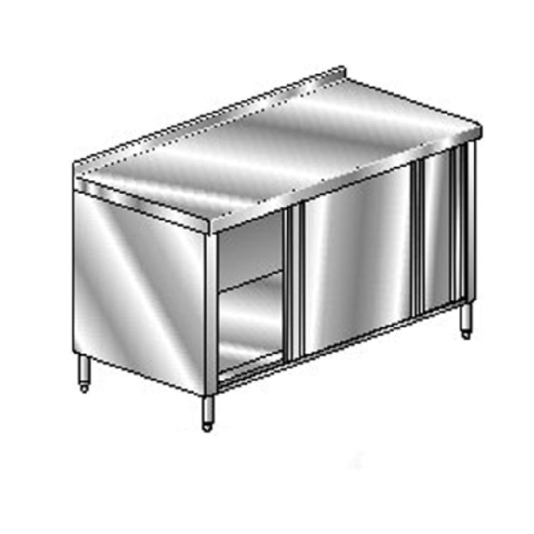 The AERO Manufacturing 3TSSOD-30120 Delux™ Work Table Cabinet Base With Sliding Doors 120"W x 30"D x 37-3/4"H showcases an outstanding blend of durability and functionality, perfectly catering to diverse industry segments. This work table features a robust 16/304 stainless steel top, reinforced with three galvanized steel box channels to ensure unparalleled strength and stability. The integrated 2-3/4"H backsplash is designed to minimize spillage, while the sound-deadened underside enhances user comfort by reducing noise during use. Equipped with two sliding doors crafted from 18/430 stainless steel, the cabinet integrates nylon roller bearing sheaves for seamless operation. The cabinet body and undershelf, also constructed from 18/430 stainless steel, provide ample storage space, enhancing organizational efficiency. Supported by 16/304 stainless steel legs with adjustable white metal feet, this work table ensures stability across various surfaces. Featuring the Aero Hemmed Safety Edge™, safety and comfort are prioritized. Shipped knocked down (KD) for convenience, this work table holds NSF certification, emphasizing its compliance with industry health standards. Ideal for professional kitchens, laboratories, and industrial settings, the AERO Manufacturing 3TSSOD-30120 delivers unmatched durability and functionality, making it an essential asset for any workspace that demands quality and efficiency.