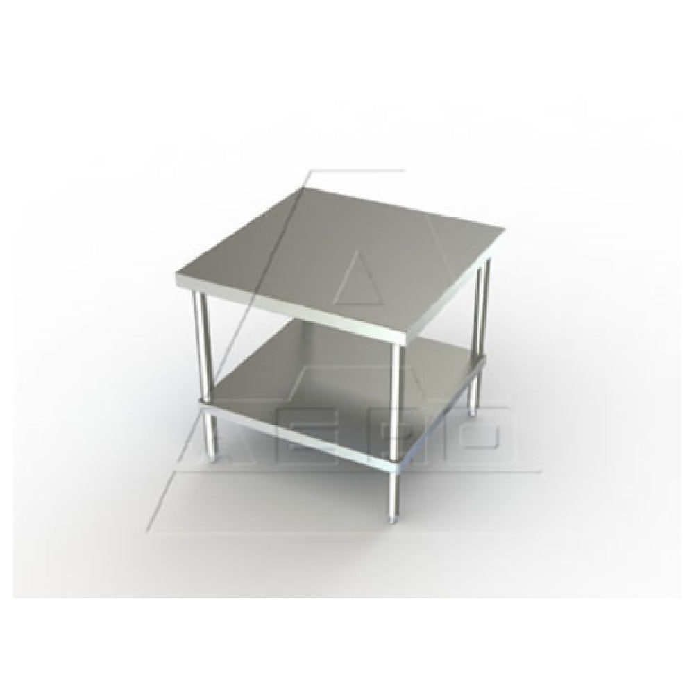 The AERO Manufacturing 4MSU-2424 Mixer Stand Open Base With Bottom Shelf is engineered to meet the rigorous demands of food service environments. This robust stand features dimensions of 24 inches in width, 24 inches in depth, and 25-1/2 inches in height, ensuring it fits seamlessly into various kitchen layouts. The top, legs, and undershelf are crafted from 16 gauge 400 series stainless steel, providing exceptional durability and resistance to corrosion. Unique to its design are the 1-7/8 inch turn down on all four sides, coupled with marine edges, enhancing its ability to manage spills and ensuring easy cleanup. Structurally reinforced with two steel box channels, this mixer stand offers unparalleled stability. The fully adjustable undershelf allows for customizable storage solutions to accommodate different equipment sizes and weights. The inclusion of the Aero Hemmed Safety Edge underscores the emphasis on safety without compromising on functionality or accessibility. This product is shipped KD (knocked down) for ease of transport and assembly. Additionally, its NSF certification confirms its adherence to public health and safety standards, making it an ideal choice for a wide array of culinary operations, from bustling commercial kitchens to artisanal bakeries, where reliability and quality are paramount.