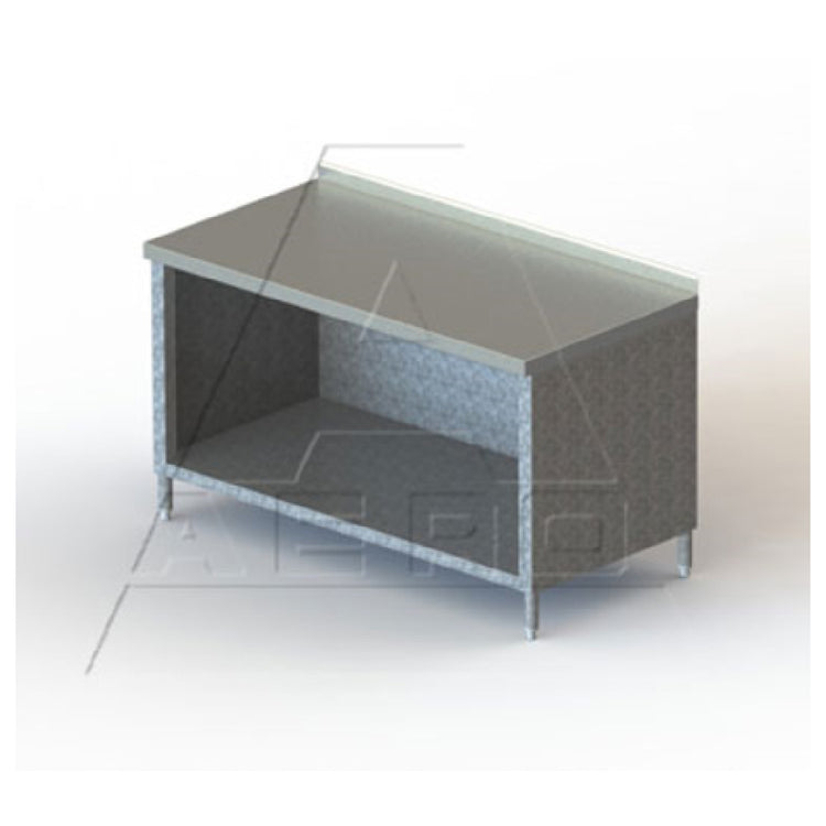 The AERO Manufacturing 4TGSO-3072 Economy Work Table Cabinet Base with Open Front is a versatile and practical option for professionals seeking efficient workspace solutions. Measuring 72 inches in width, 30 inches in depth, and standing at 37-3/4 inches high, this work table is designed to fit seamlessly into various industrial and commercial environments. The table's top is crafted from 16/430 stainless steel, reinforced with three galvanized steel box channels, ensuring durability and stability under heavy use. A 2-3/4-inch high backsplash is included, protecting walls from potential spills and splashes. To minimize noise, the underside of the tabletop is sound deadened. The cabinet body and undershelf are made from 18-gauge galvanized steel, providing additional storage space and structural integrity. The legs are constructed from 16-gauge galvanized steel and feature adjustable plastic feet, allowing for customization in height and leveling on uneven surfaces. The work table incorporates the Aero Hemmed Safety Edge, enhancing safety by reducing sharp edges. It is shipped knocked down (KD) for efficient transportation and storage. This product is NSF certified, ensuring compliance with public health and safety requirements, making it an ideal choice for a range of industries, from food service to manufacturing.