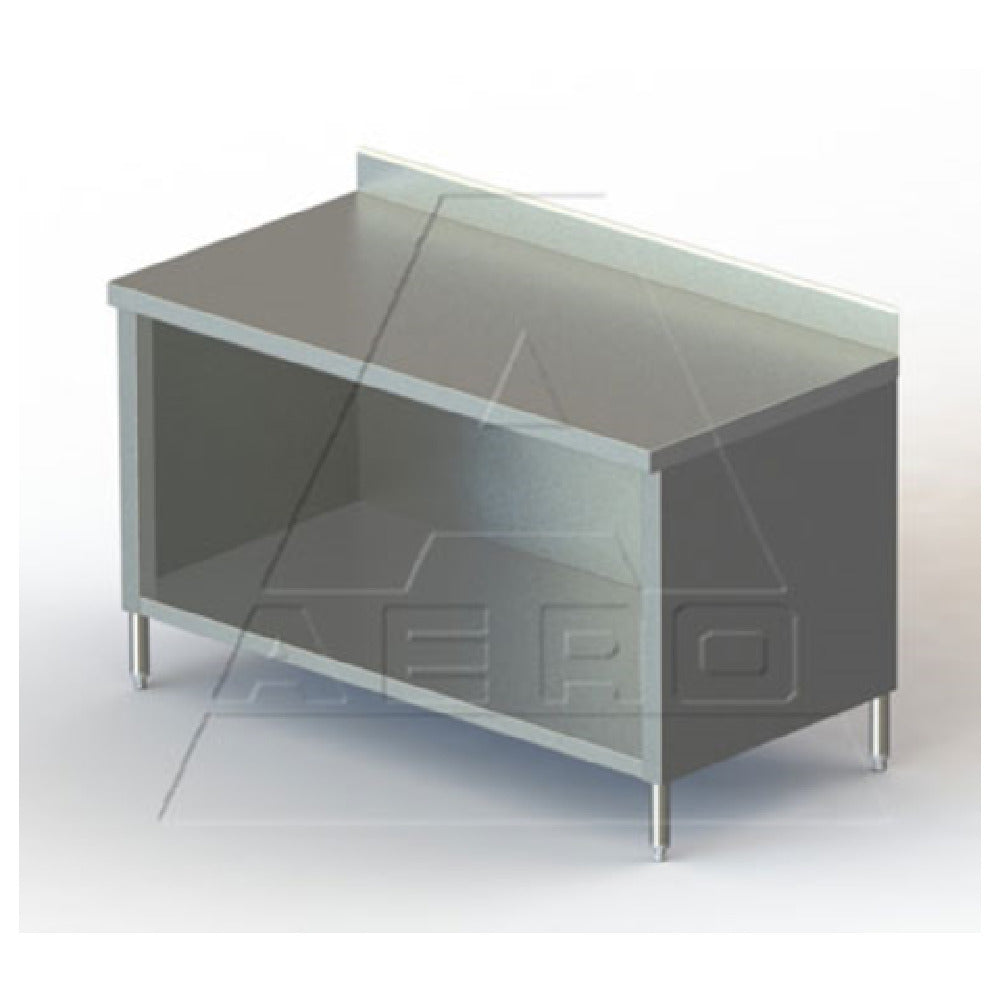 The AERO Manufacturing 4TSBO-2472 Economy Work Table Cabinet Base With Open Front 72"W X 24"D X 39"H is a versatile solution designed for efficiency and durability in various industrial environments. With a 16/430 stainless steel top reinforced by two galvanized steel box channels, this work table offers robust support for demanding tasks. Its 4"H backsplash ensures easy maintenance and cleanliness in busy settings. The sound-deadened underside minimizes noise, enhancing the work environment. The cabinet body and undershelf are constructed from 18/430 stainless steel, providing ample storage space with an open front for easy access. The 16/304 stainless steel legs with adjustable white metal feet ensure stability on uneven surfaces. The Aero Hemmed Safety Edge enhances safety, reducing the risk of injury during use. Shipped knocked down (KD) for convenient transportation, this work table is NSF certified, meeting rigorous public health and safety standards. Its substantial dimensions of 72"W x 24"D x 39"H cater to a wide range of applications, from commercial kitchens to laboratories, offering a reliable and practical workspace that meets the demands of various industries.