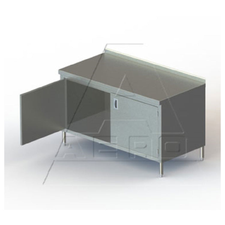 AERO Manufacturing 4TSSOHD-3072 Economy Work Table Cabinet Base With Hinged Doors 72"W X 30"D X 37-3/4"H is a high-quality, versatile work table designed for efficiency and durability in various professional environments. The table features a robust 16/430 stainless steel top, reinforced with three galvanized steel box channels, ensuring a sturdy and reliable workspace. A 2-3/4"H backsplash enhances cleanliness and safety, while the sound deadened underside minimizes noise during use. The cabinet base includes two 18/430 stainless steel hinged doors with integral handles and stainless steel piano hinges, providing secure and convenient storage. The cabinet body and undershelf are also constructed from 18/430 stainless steel, offering longevity and resistance to corrosion. Supported by 16/304 stainless steel legs with adjustable white metal feet, this table is both stable and adaptable to uneven surfaces. The Aero Hemmed Safety Edge adds an extra layer of protection, preventing injury from sharp edges. Shipped knocked down (KD) for easy transportation and assembly, this work table is NSF certified, ensuring compliance with industry health and safety standards. Ideal for commercial kitchens, laboratories, and other industrial settings, the AERO Manufacturing 4TSSOHD-3072 is a reliable and practical solution for diverse operational needs.