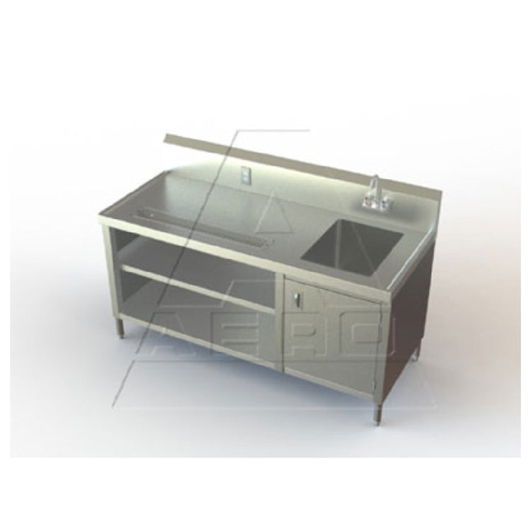 The AERO Manufacturing BVT-96 Beverage Table is an expertly crafted piece suited for diverse professional environments, measuring 96 inches wide by 30 inches deep. Its robust construction includes a 7/8-inch turn down on three sides and a 10-inch backsplash, effectively preventing spills and ensuring cleanliness. The table features a 21-inch by 16-inch by 14-inch deep sink and an urn trough with a grate for efficient liquid management. A duplex electrical outlet enhances its functionality, accommodating various electrical needs. The table is composed of a 14-gauge 300 series stainless steel top, an 18-gauge 430 stainless steel cabinet and undershelf, and 16-gauge 300 series stainless steel legs, ensuring durability and longevity. White metal feet provide stability, while the fully welded, sound deadened construction minimizes noise during use. The BVT-96 is customizable with a choice of bowl location, either left or right-hand side, to suit specific workspace requirements. This beverage table excels in offering a combination of strength, practicality, and customizable features, making it an invaluable asset to the food and beverage industry.