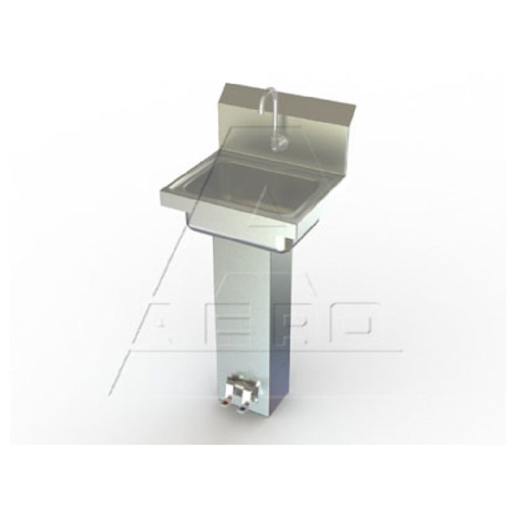 The AERO Manufacturing HSB Hand Sink Wall Mount 14" Wide x 10" Front-to-back x 5" Deep is a compact and efficient solution for a variety of commercial and industrial settings. Crafted from durable stainless steel, this hand sink is designed to withstand the demands of high-use environments, ensuring longevity and reliability. Its dimensions - 14 inches wide, 10 inches front-to-back, and 5 inches deep - make it an ideal choice for spaces where efficiency and space-saving are paramount. The sink features an 8-inch splash on the back to prevent water from spilling onto walls, maintaining cleanliness and hygiene. The pedestal base with foot pedals allows for hands-free operation, promoting sanitary conditions especially in food service and healthcare industries. Additionally, it includes a gooseneck splash mount spout for easy water access and a basket for convenient waste collection. Certified by NSF, this hand sink meets stringent health and safety standards, making it suitable for use in professional kitchens, restaurants, and any location adhering to strict hygiene protocols. The AERO Manufacturing HSB Hand Sink is a versatile and indispensable asset for any establishment requiring a reliable handwashing station.
