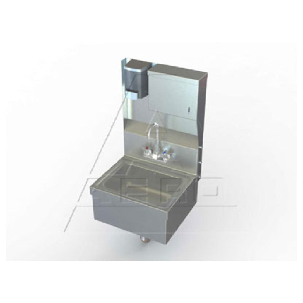 The AERO Manufacturing HSDTAXHD Hand Sink Wall Mount is a highly functional unit designed to meet specific requirements for various professional environments, including those that adhere to stringent standards like prison specifications. With dimensions of 14 inches in width, 10 inches front-to-back, and a depth of 5 inches, this hand sink provides a compact yet practical solution for areas where space is a premium. Constructed from durable stainless steel, it promises longevity and resistance to corrosion, making it ideal for high-use settings. The sink is equipped with an 8-inch backsplash and includes wall brackets for secure installation, ensuring water containment and protection for the surrounding areas. Its gooseneck splash mount faucet facilitates easy access and efficient water flow, while the inclusion of an overflow and P-trap underscores its thoughtful design for safety and maintenance. The addition of a soap and towel dispenser further enhances its practicality, catering to hygiene needs. The apron design adds a layer of protection and aesthetic appeal. Certified by NSF, this product meets rigorous public health and safety standards, making it a versatile choice suitable for diverse industry segments requiring a reliable, space-efficient handwashing solution.