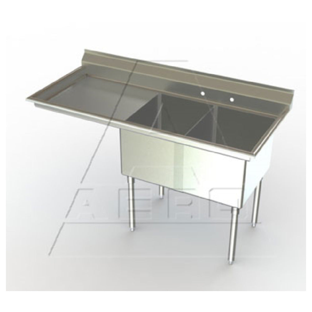 The AERO Manufacturing MF2-2424-30L Economy Sink Two Compartment is a versatile and practical addition to any commercial kitchen. With dimensions of 82-1/4"W x 30"D x 39-1/2"H, this sink is constructed from durable 16/304 stainless steel, ensuring longevity and resistance to corrosion. It features two 24" x 24" x 14" deep fabricated compartments, making it perfect for handling various washing and preparation tasks. The 30" drainboard on the left provides ample space for drying or additional prep work. A 7" high backsplash protects walls from water damage, accommodating 8" OC splash mount faucet holes for easy installation of compatible faucets. The sink includes raised rolled edges on the front and sides to prevent spills and enhance safety. Fully welded stainless steel gussets and 16/430 stainless steel legs with adjustable stainless steel feet contribute to its stability and sturdiness. The Aero Hemmed Safety Edge adds an extra layer of safety, minimizing sharp edges. The sink is designed as a knock-down (KD) unit for convenient shipping and assembly and meets NSF standards for public health protection. This combination of features makes it suitable for various segments of the foodservice industry, offering reliability and efficiency in everyday operations.